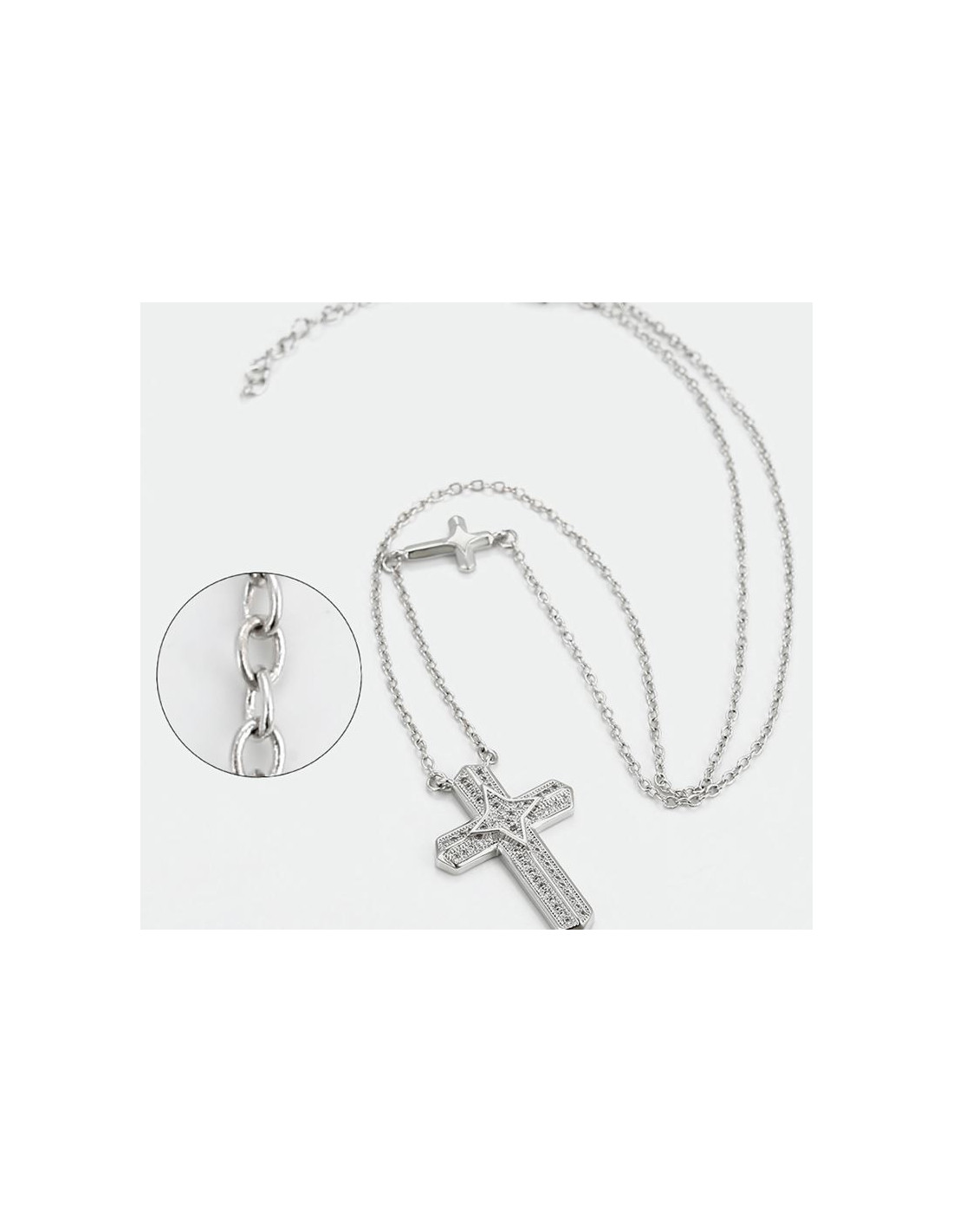 Ketting in koperen rhodium, verzilverde metalen look, met twee Rhodium hangers. De hangers zijn twee kruizen, het kleine is geïntegreerd in de ketting, het grote is opgehangen als hoofdhanger. Deze laatste is ingelegd met synthetische CZ (Swarovski) kristallen.