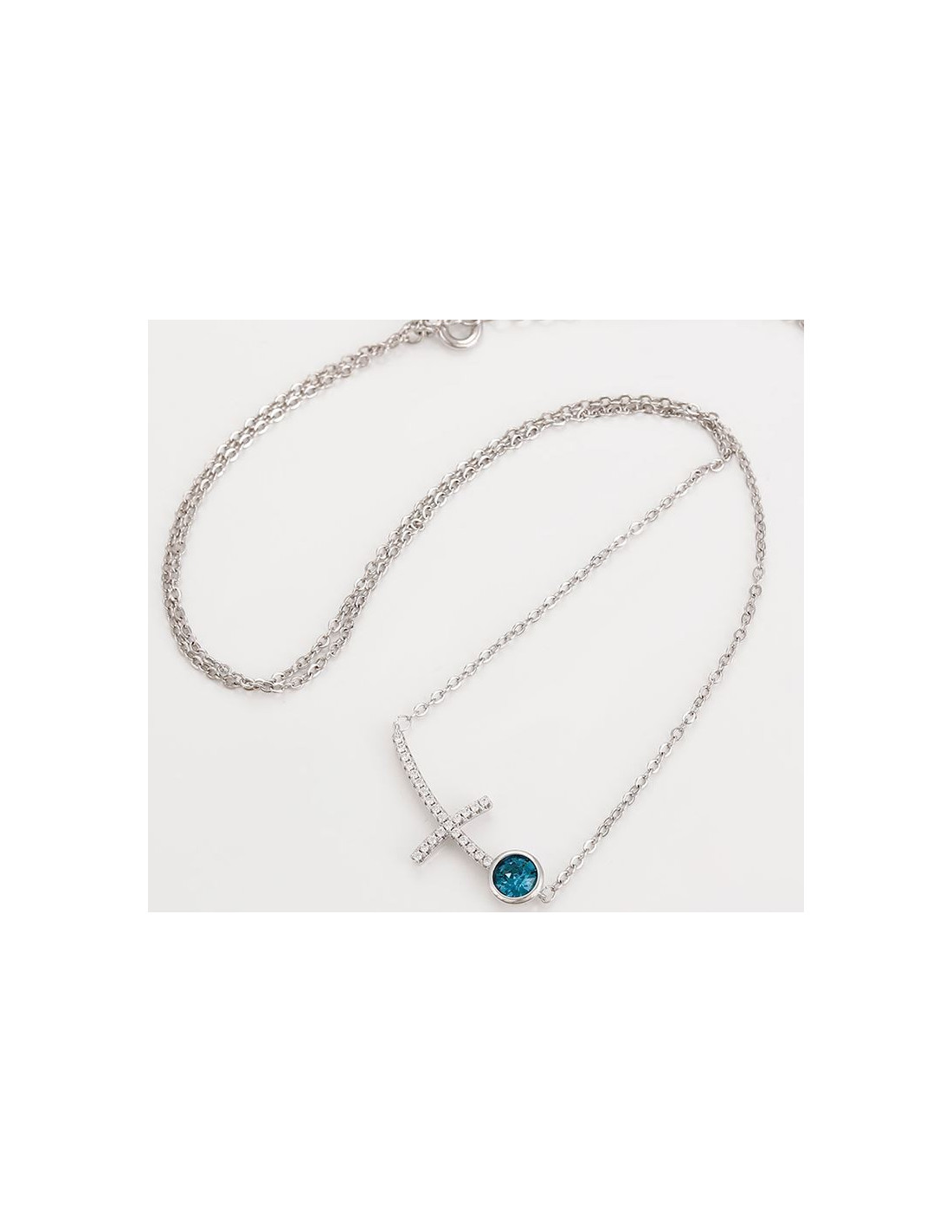 Vergeet uw aanpassingen niet op te slaan, anders kunt u het product niet aan de winkelwagen toevoegenKetting en hanger in rhodium en Swarovski-kristallen. De hanger is een kruisliggend en licht gebogen, ingelegd met kleine kristalletjes, met daarbovenop een blauw kristal.