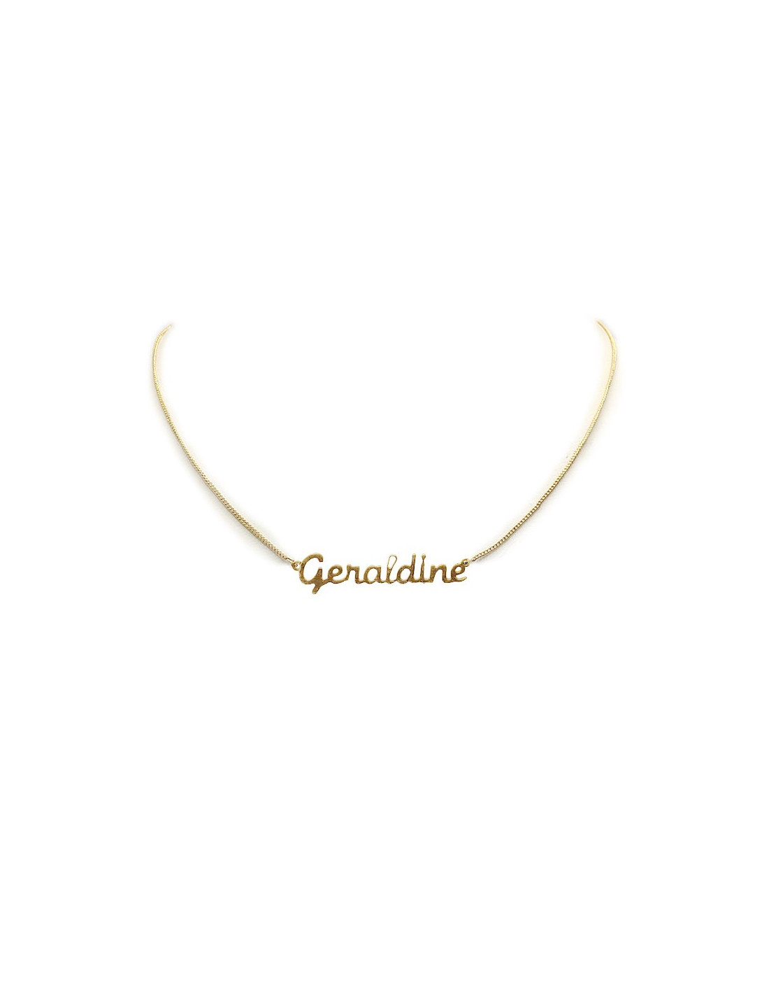 Toon uw voornaam of die van een geliefde met deze vergulde choker. De naam "Géraldine", in nette vergulde letters, is gezet op een vergulde metalen ketting. Afgeleid van de Germaanse woorden gari (speer) en wald (regeren), symboliseert het stille kracht en welwillend leiderschap. Dit verfijnde sieraad is een lieflijk cadeau-idee, perfect voor een verjaardag, jubileum of speciale gelegenheid.