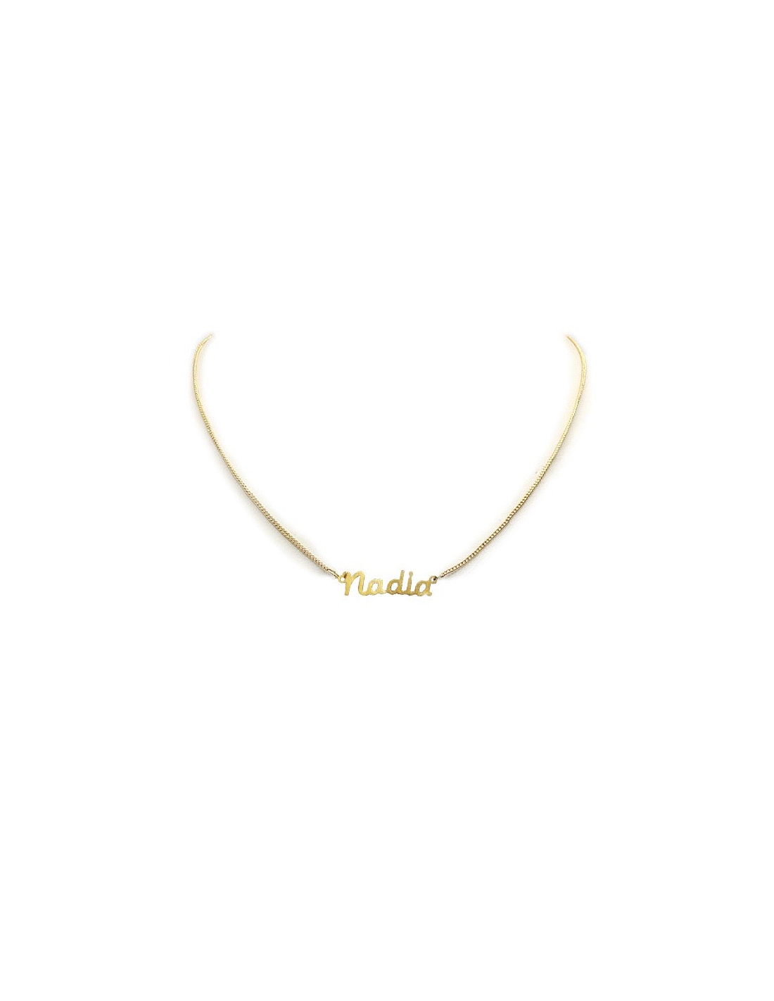 Toon uw naam of die van een geliefde met deze vergulde choker. De naam "Nadia", in nette letters, is verguld op een vergulde metalen ketting. Deze naam, van Slavische of Arabische oorsprong, afhankelijk van de bron, betekent "hoop" of "tederheid" en wekt vertrouwen en aandacht op. Dit verfijnde sieraad is een teder cadeau-idee, perfect voor een verjaardag, jubileum of speciale gelegenheid.