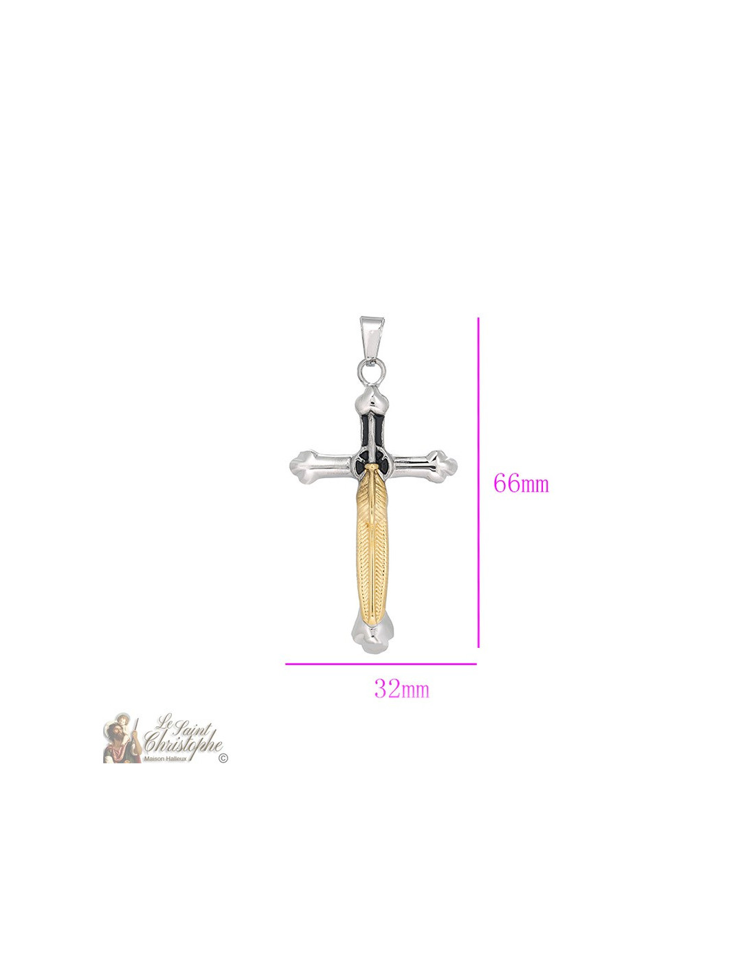 Roestvrij stalen hanger in de vorm van een zilverkleurig kruis met een gouden penpunt erbovenop. Het kruis is versierd met enkele zwarte emails voor een beter contrast met de fijn bewerkte penpunt.