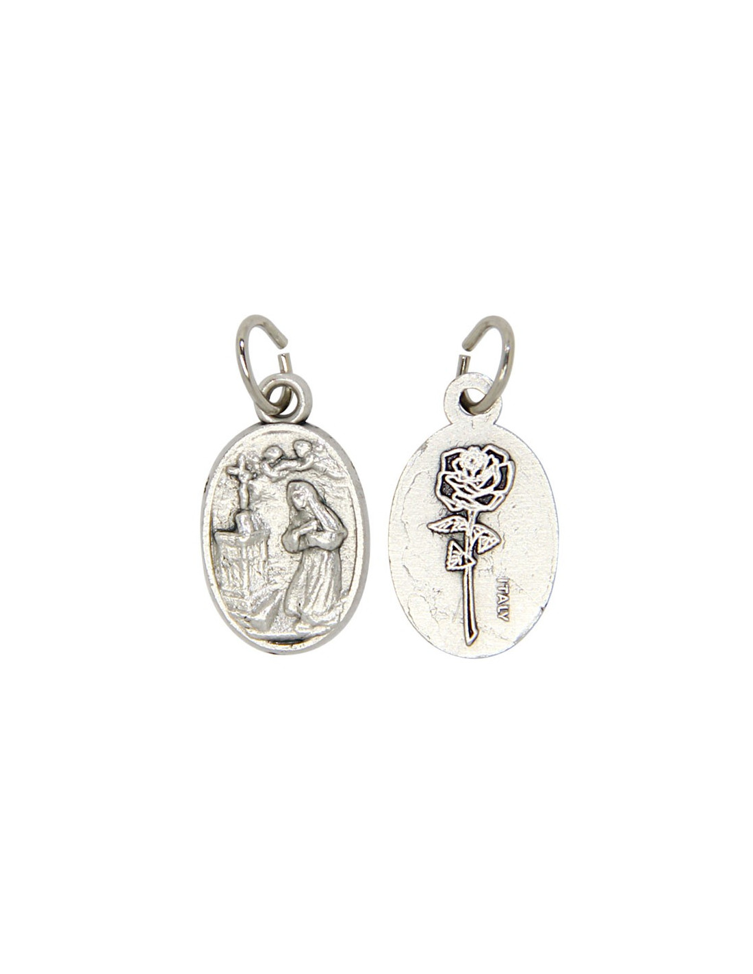 Deze ovale medaille is van verzilverd metaal en stelt de heilige Rita voor. Deze heilige is de patrones van wanhopige zaken en zou helpen bij de genezing van ziekten of wonden. Op de voorzijde van de medaille staat de beeltenis van de heilige Rita voor het kruis van Christus, de achterzijde is versierd met een roos, symbool van de heilige Rita bij uitstek.