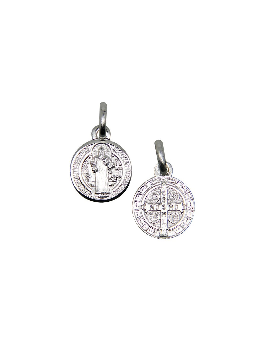 Deze ronde hanger van verzilverd metaal heeft de beeltenis van de medaille van Sint Benedictus. Deze medaille is, volgens de katholieke godsdienst, een krachtig symbool van bescherming tegen het Kwaad, de negatieve of kwaadwillige energieën en personen.