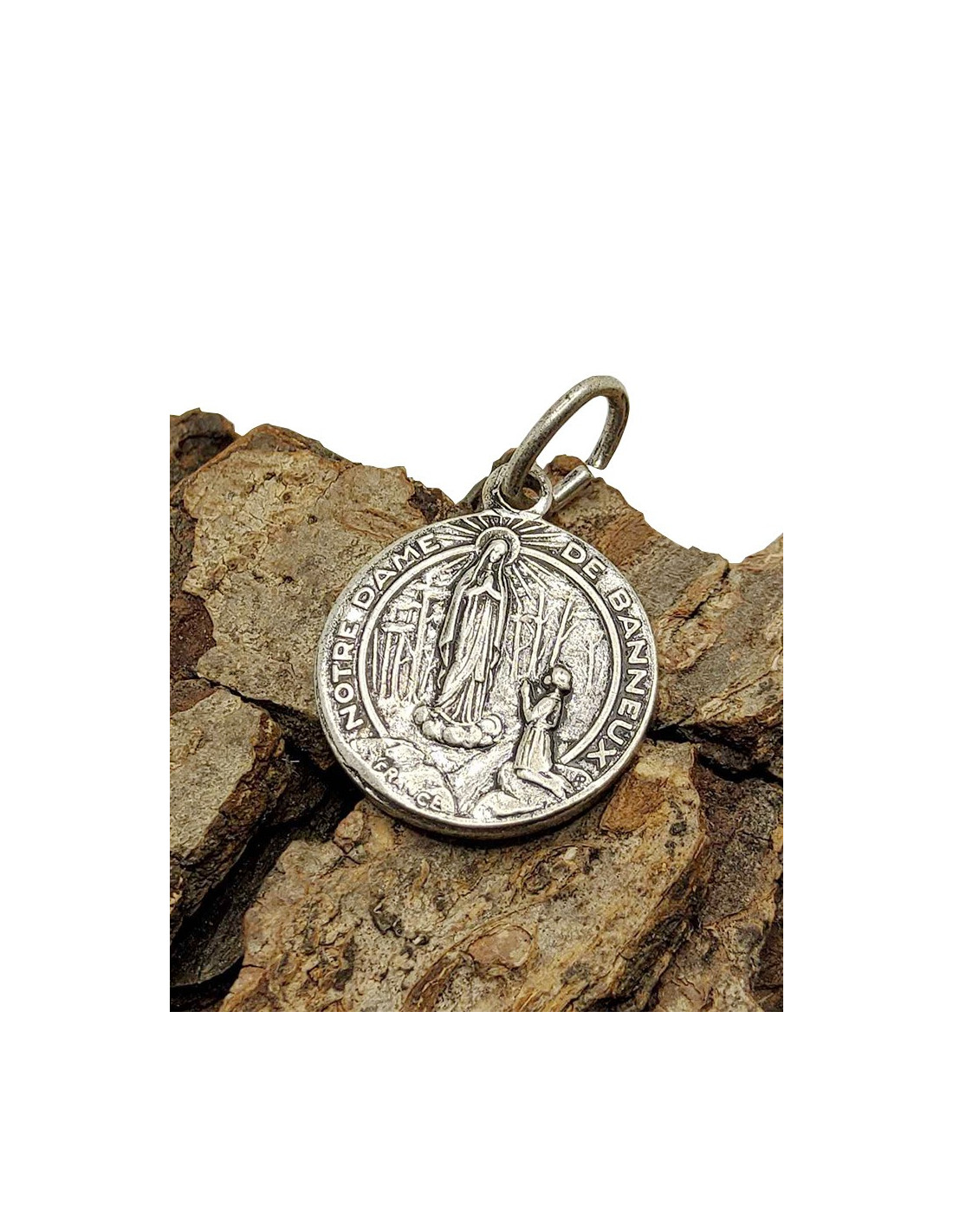 Medaille van de Maagd der Armen van Banneux Notre-Dame, die acht keer verscheen aan de kleine Mariette Beco. Fantasiemedaille van zilvergrijs metaal. Een mooi aandenken aan deze heilige plaats, waarvan de wonderen door de Kerk worden erkend. De Maagd der Armen verlicht het lijden van degenen die haar medaille dragen.