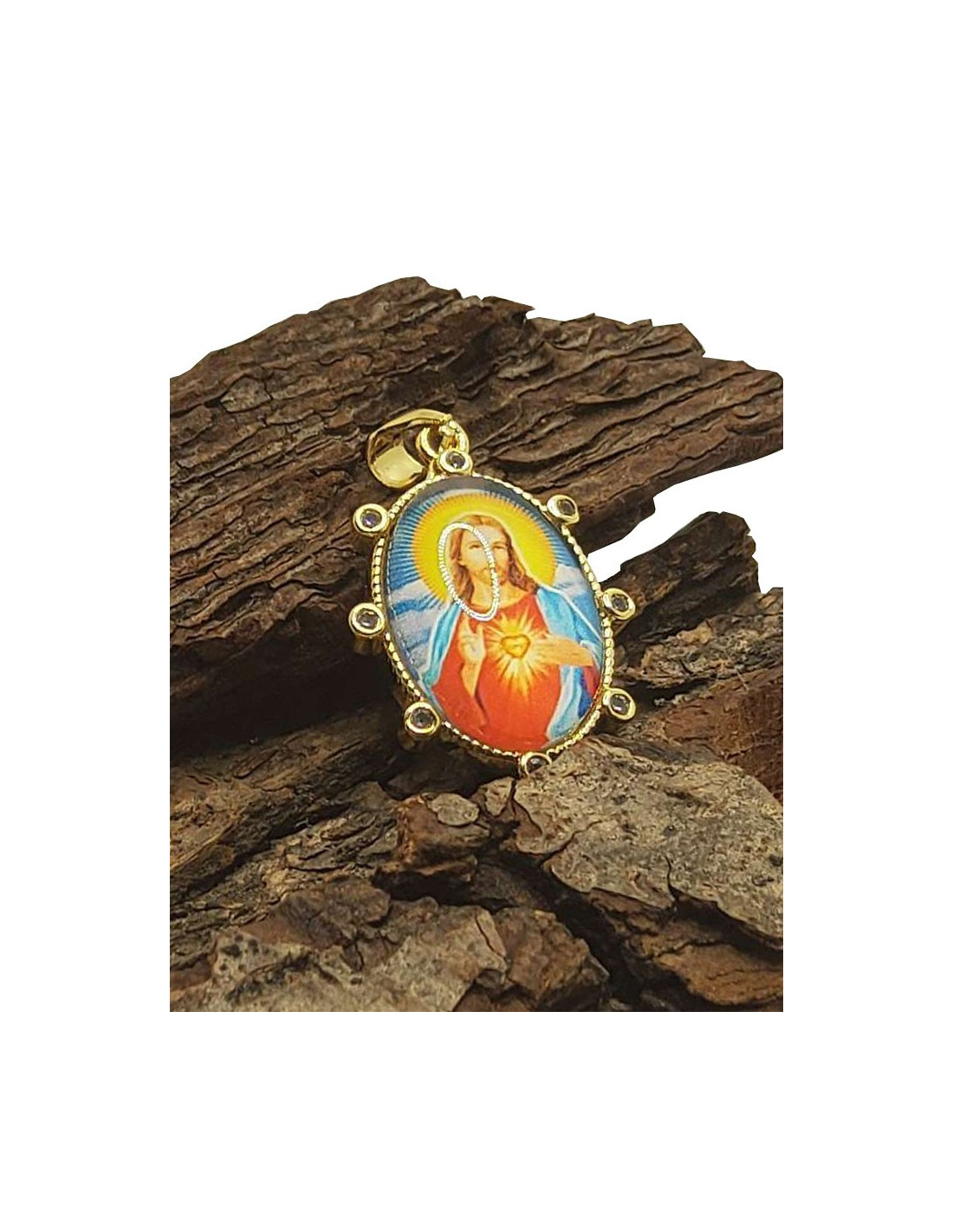 Medaille van het Heilig Hart van Jezus in sierlijk goudkleurig metaal, bezet met strass-steentjes. Het beeld van Jezus Christus toont hem met levendige kleuren. De voorstelling van Jezus wordt beschermd door een laag koepelvormige hars, waardoor een mooie cabochon ontstaat. De rand van de medaille is versierd en bezet met strass-steentjes. Het Heilig Hart van Jezus is een symbool van onvoorwaardelijke liefde en vergeving. Het is een prachtig geschenk voor een geliefde of voor uzelf, een discreet religieus sieraad.