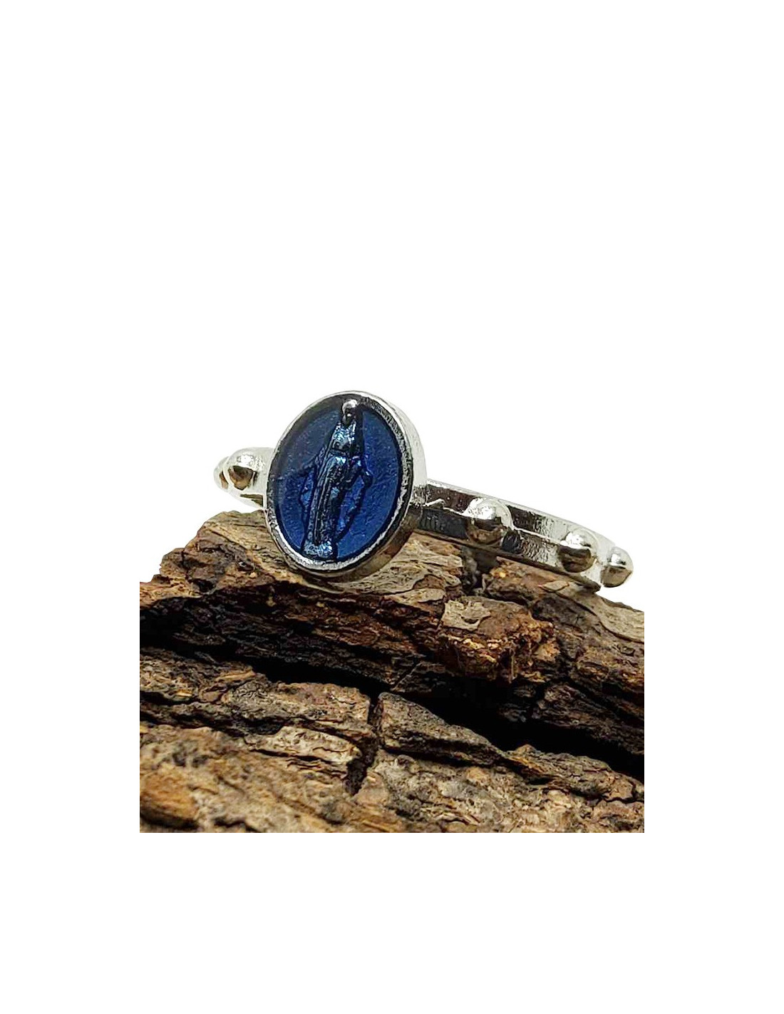 Rozenkransring van fantasie-metaal met een medaille van de Wonderbaarlijke Maagd, bedekt met donkerblauw transparant email. Deze diepe blauwe kleur laat het reliëf van de medaille subtiel uitkomen. Rozenkransringen hebben als bijzonderheid dat ze rondom de ring kleine bolletjes hebben die dienen als draagbare rozenkrans, een tiental gebedsrozenkransen die u als elegant gebedshulpmiddel bij u kunt dragen.