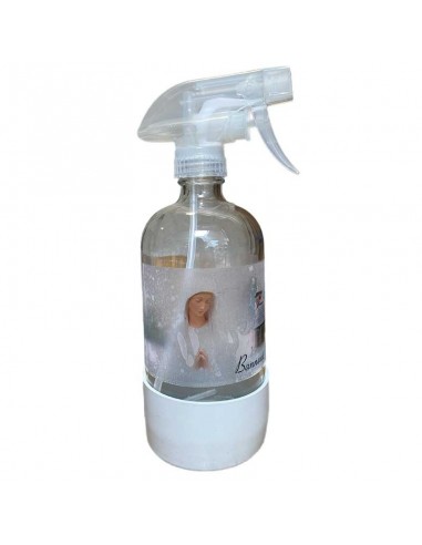 Glazen fles met Maagd der Armen van Banneux sticker, pompverstuiver en gekleurde siliconen basis. Deze spray kan alle vloeibare producten bevatten die je dagelijks nodig hebt, van wijwater tot huishoudelijke producten en cosmetica zoals parfums, essentiële oliën en crèmes. De dop heeft een siliconen afdichting en de basis is antislip.