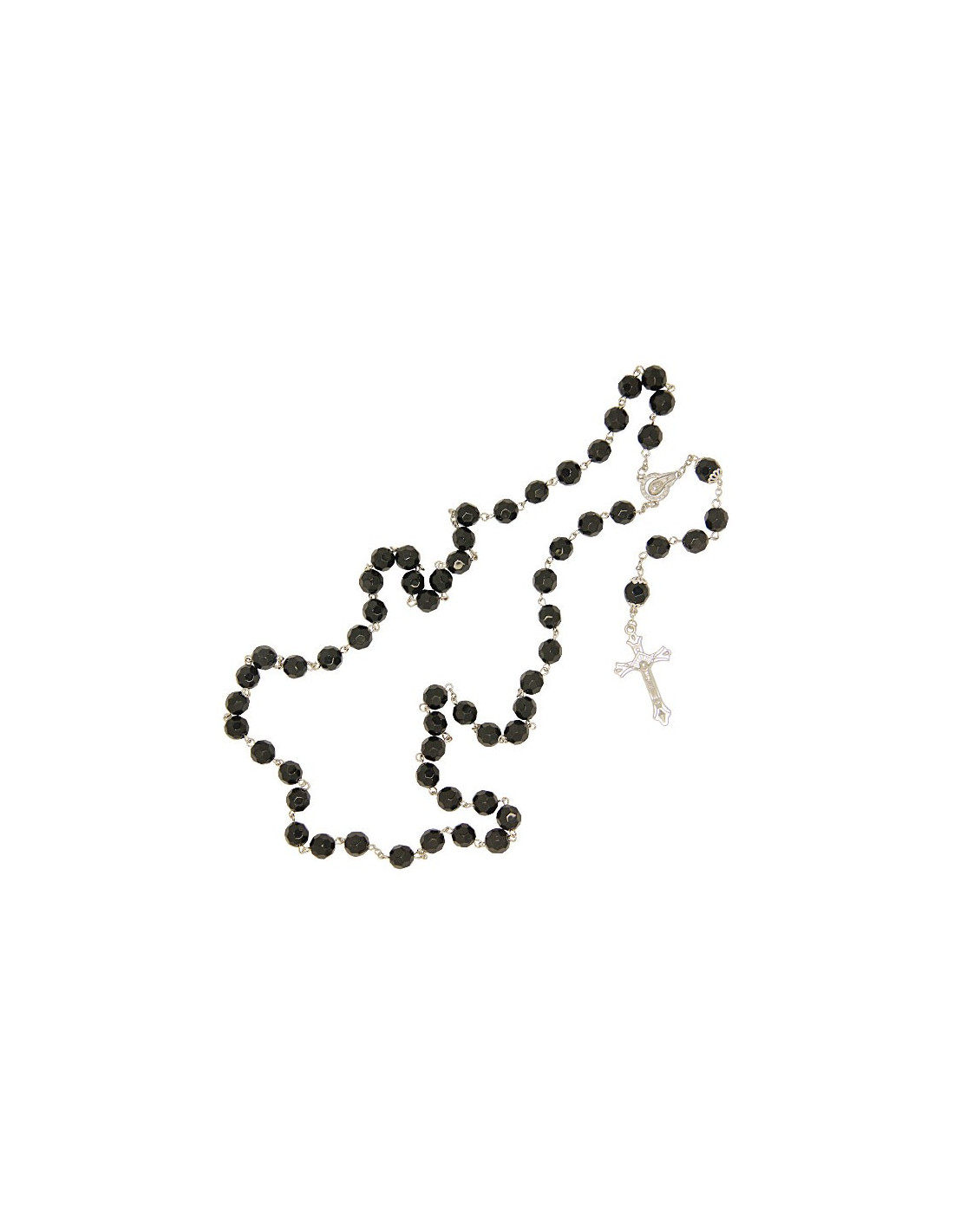 Rozenkrans van facetgeslepen zwarte glaskralen aan een zilverkleurige metalen ketting. De facetten zijn zo geslepen dat ze zacht aanvoelen. Het kruis van Christus is fijn geciseleerd. De centrale medaille heeft een gestileerd portret van de Maagd Maria.