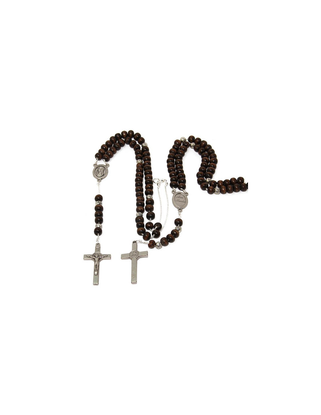Rozenkrans met donkerbruine houten kralen gemonteerd op een verzilverde metalen ketting. De centrale medaille is een bas-reliëf van de Heilige Maagd met verbonden handen met, op de achterkant van de medaille, de noot Ave Maria. De kralen van het Onze Vader zijn zo gekerfd dat ze op kleine zilverkleurige roosjes lijken. Het kruis is in klassieke stijl met een medaille van St. Benedictus als aureool voor Jezus.