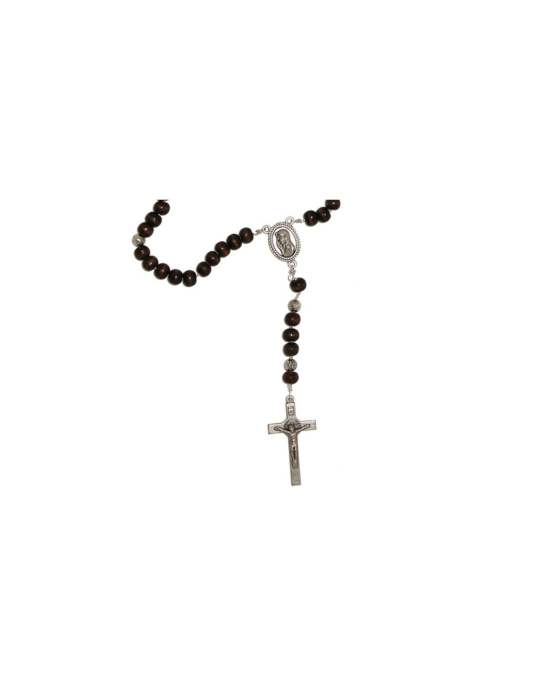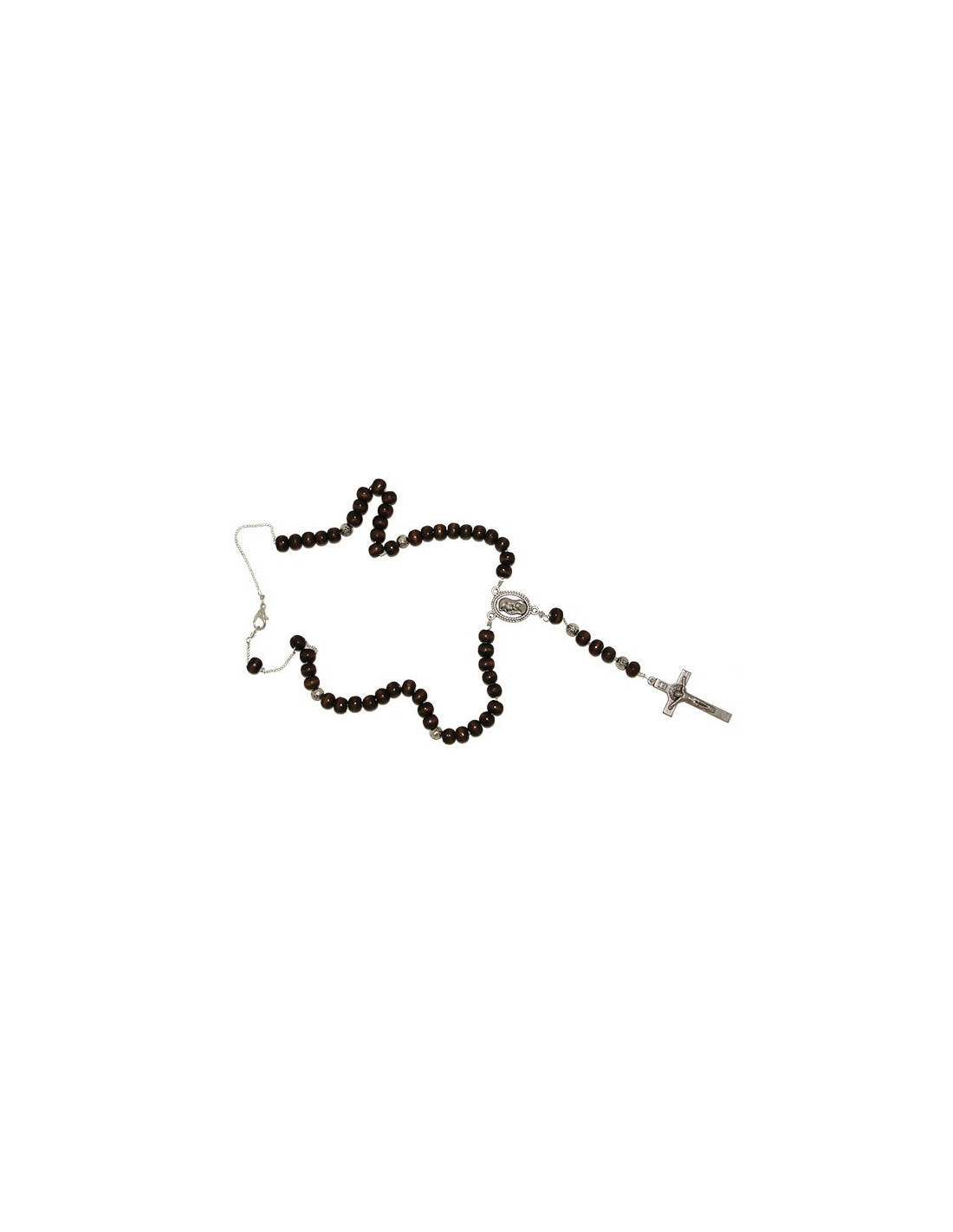 Rozenkrans met donkerbruine houten kralen gemonteerd op een verzilverde metalen ketting. Deze rozenkrans kan gebruikt worden als halsketting.