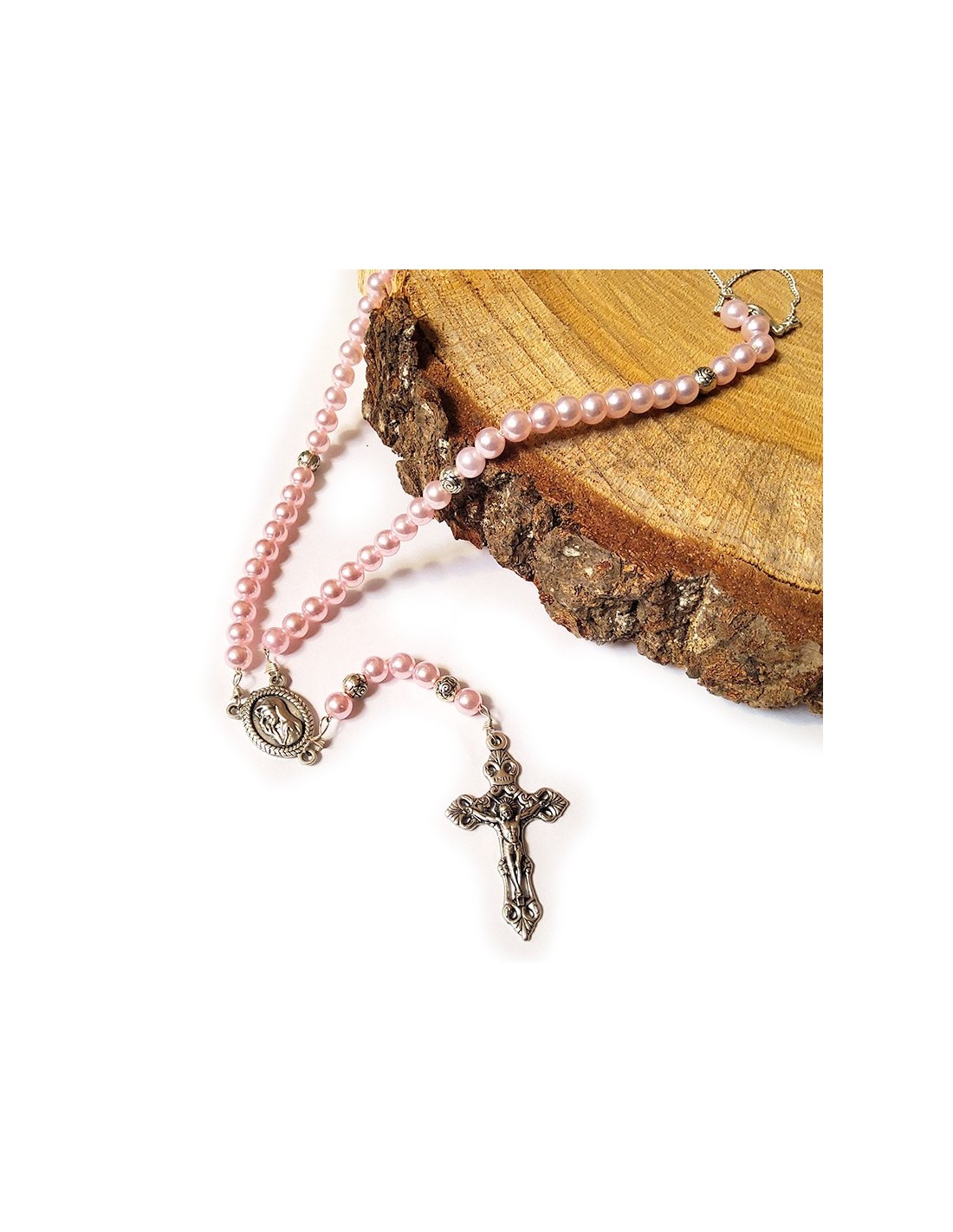Rozenkrans van satijnachtige pastelroze kunststof met zilverkleurige metalen ketting. Sommige kralen, evenals de medaille en hanger, zijn ook van metaal. Op de medaille staat een afbeelding van de Maagd Maria met een Weesgegroet op de achterkant. De hanger is een fijn gesneden arabesk kruis. De rozenkrans sluit met een karabijnsluiting.