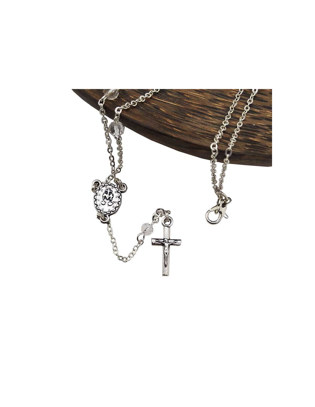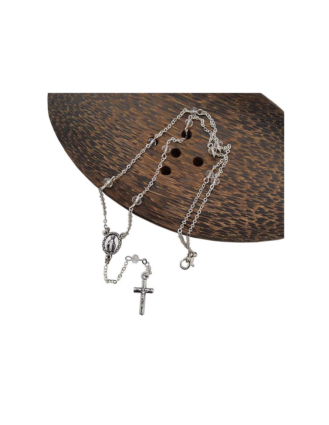 Verfraai je dagelijks leven met deze rozenkransketting, een discreet en sober religieus sieraad van verzilverd metaal en transparante kristallen kralen. De medaille heeft de beeltenis van de Wonderbaarlijke Maagd, een symbool van bescherming, liefde en genezing.