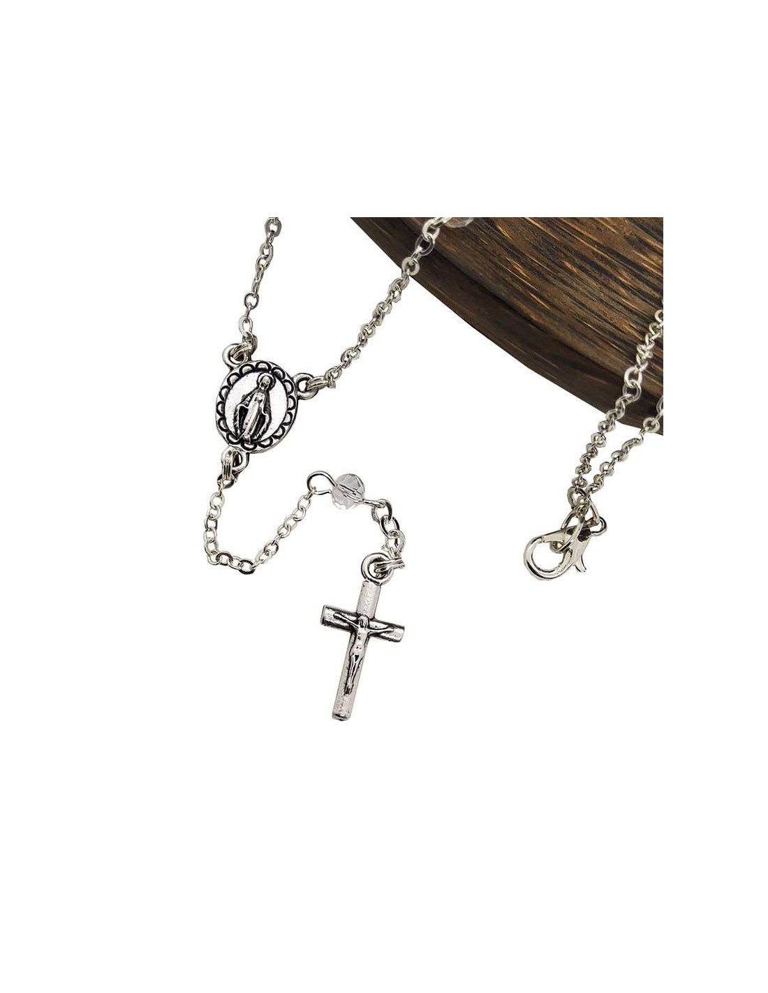 Verfraai je dagelijks leven met deze rozenkransketting, een discreet en sober religieus sieraad van verzilverd metaal en transparante kristallen kralen. De medaille heeft de beeltenis van de Wonderbaarlijke Maagd, een symbool van bescherming, liefde en genezing.