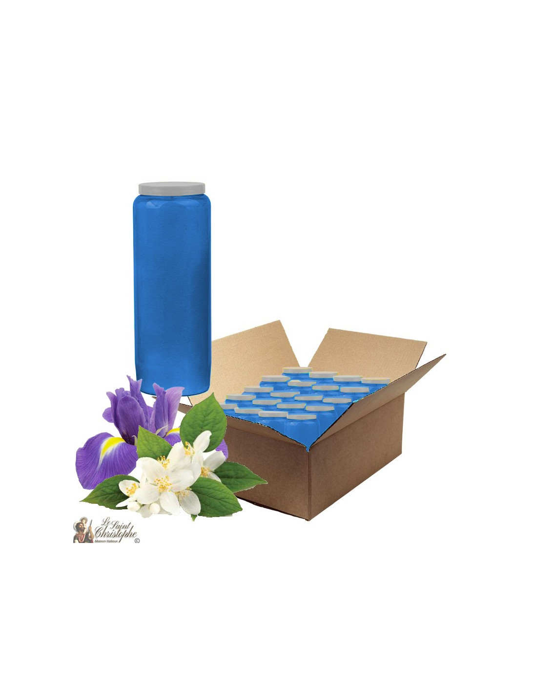 Novenakaars met jasmijn en irisgeur, donkerblauw. Een doos bevat 20 kaarsen.