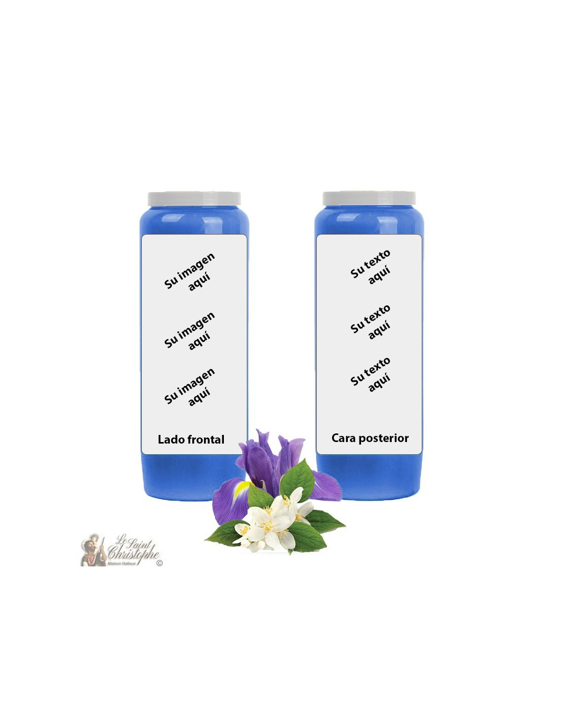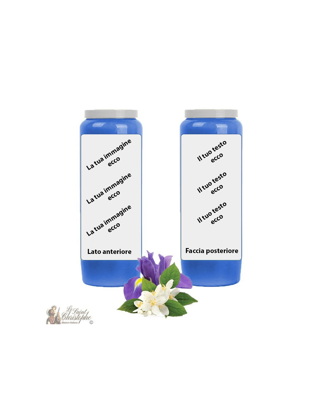 Donkerblauwe noveenkaars met jasmijn-irisgeur, personaliseerbaar met uw afbeelding en tekst. Het jasmijn-irismengsel brengt rust en een betere luchtkwaliteit.