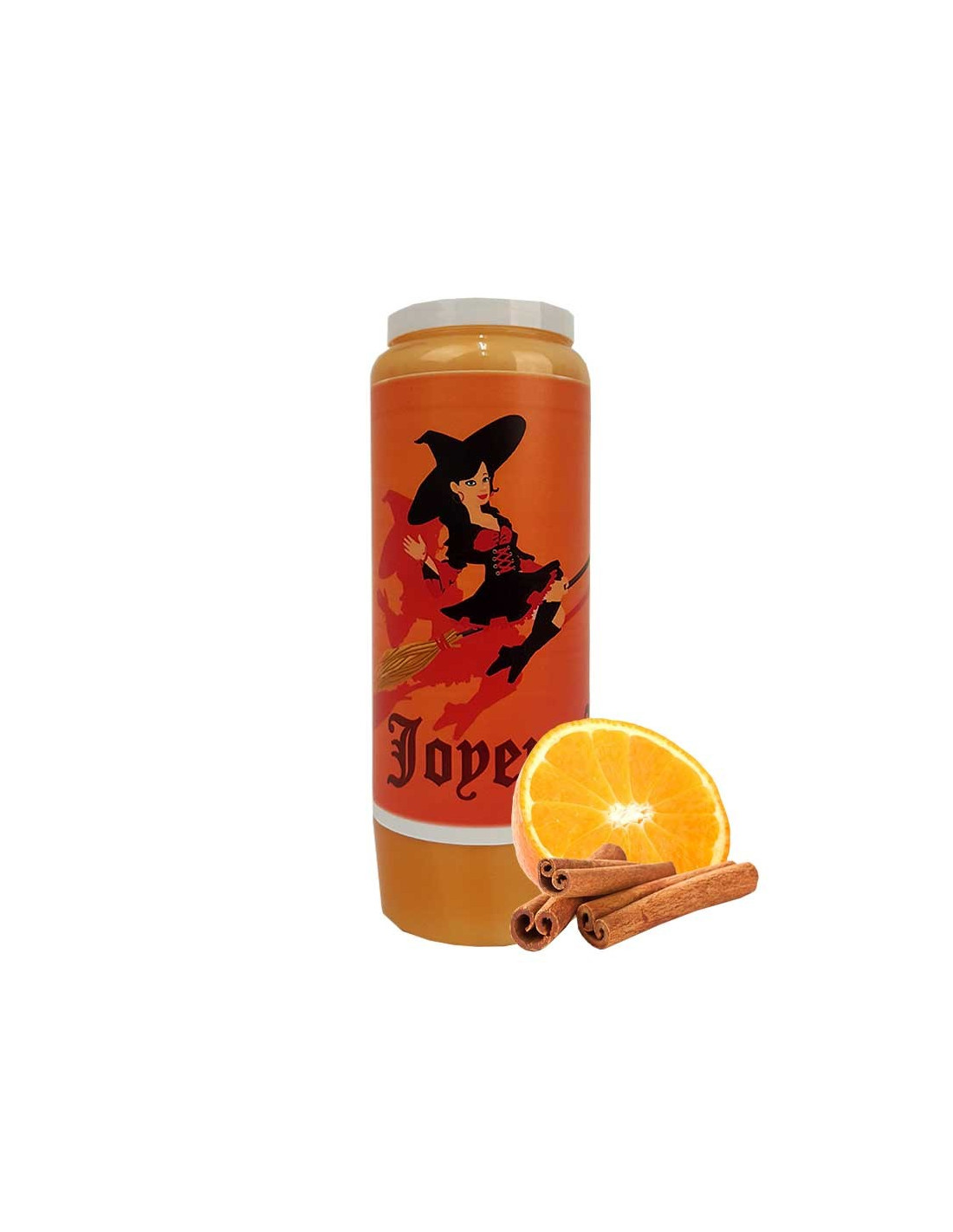Oranje kaneel noveenkaars met een speciale Halloween illustratie van een schattige heks en een korte tekst.
