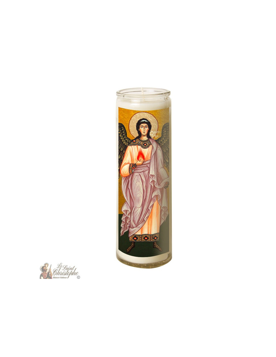 Met de afbeelding van de aartsengel Sint Uriël als versiering kan deze kaars gebruikt worden voor gebed, meditatie, versiering of zelfs esoterie. Achterzijde van de kaars aanpasbaar met een tekst.