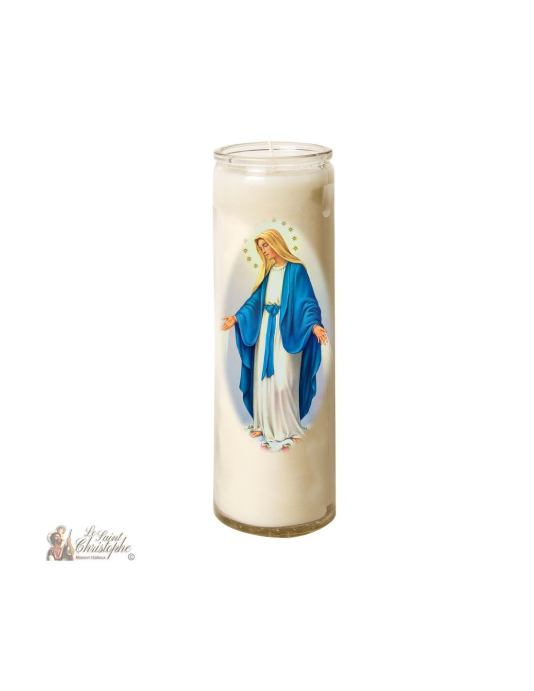 Met de afbeelding van de Wonderbaarlijke Maagd als versiering kan deze kaars gebruikt worden voor gebed, meditatie, versiering of zelfs esoterie. Achterzijde van de kaars aanpasbaar met een tekst.