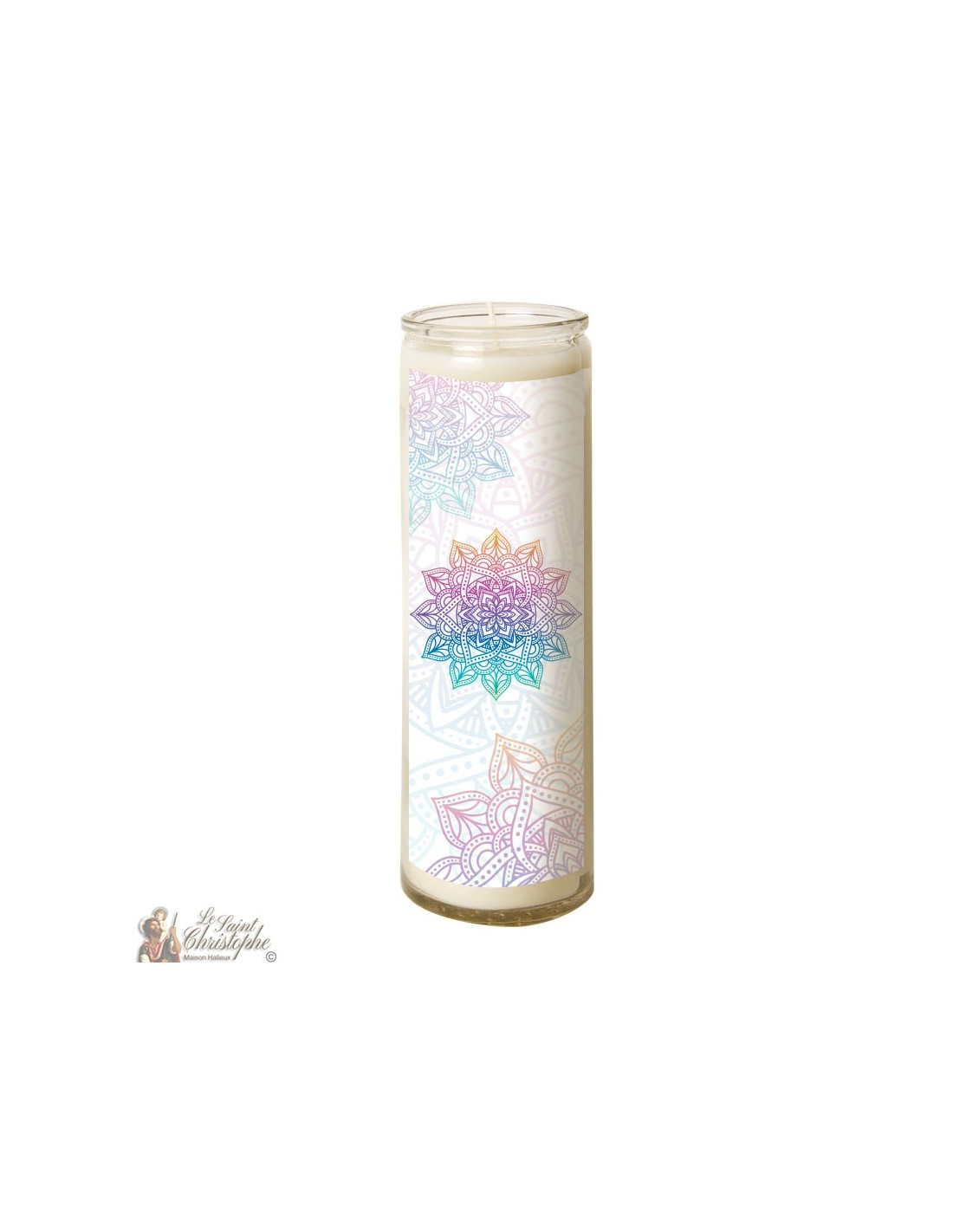 Met de afbeelding van veelkleurige mandala's als decoratie kan deze kaars gebruikt worden voor gebed, meditatie, decoratie of zelfs esoterie.