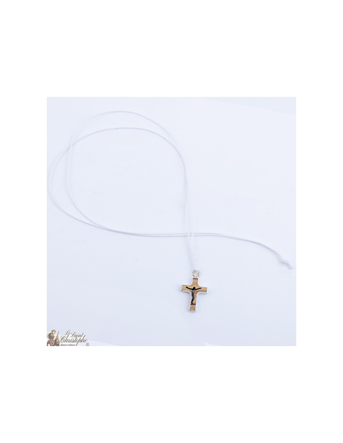 Ketting met verstelbaar koord en hanger van olijfhout. Het koord en de randen van de hanger, een kruis, zijn wit geschilderd. De binnenkant van het kruis is gesneden naar het beeld van de gekruisigde Jezus Christus.