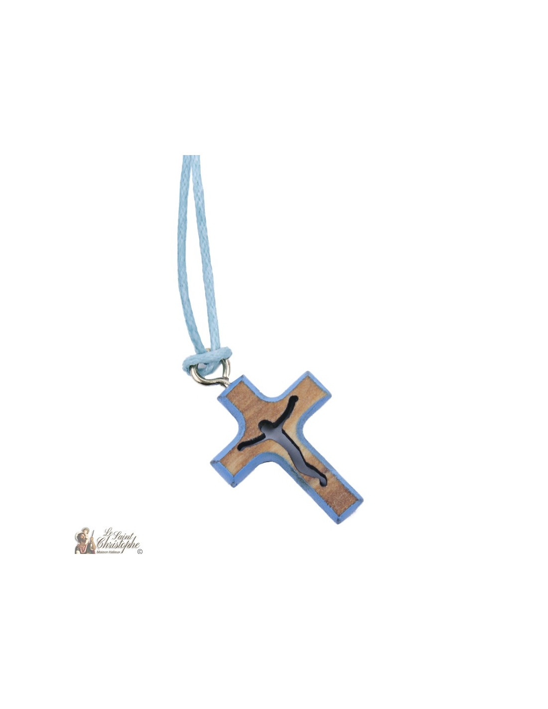 Ketting met verstelbaar koord en hanger van olijfhout. Het koord en de randen van de hanger, een kruis, zijn blauw geschilderd. De binnenkant van het kruis is gesneden naar het beeld van de gekruisigde Jezus Christus.
