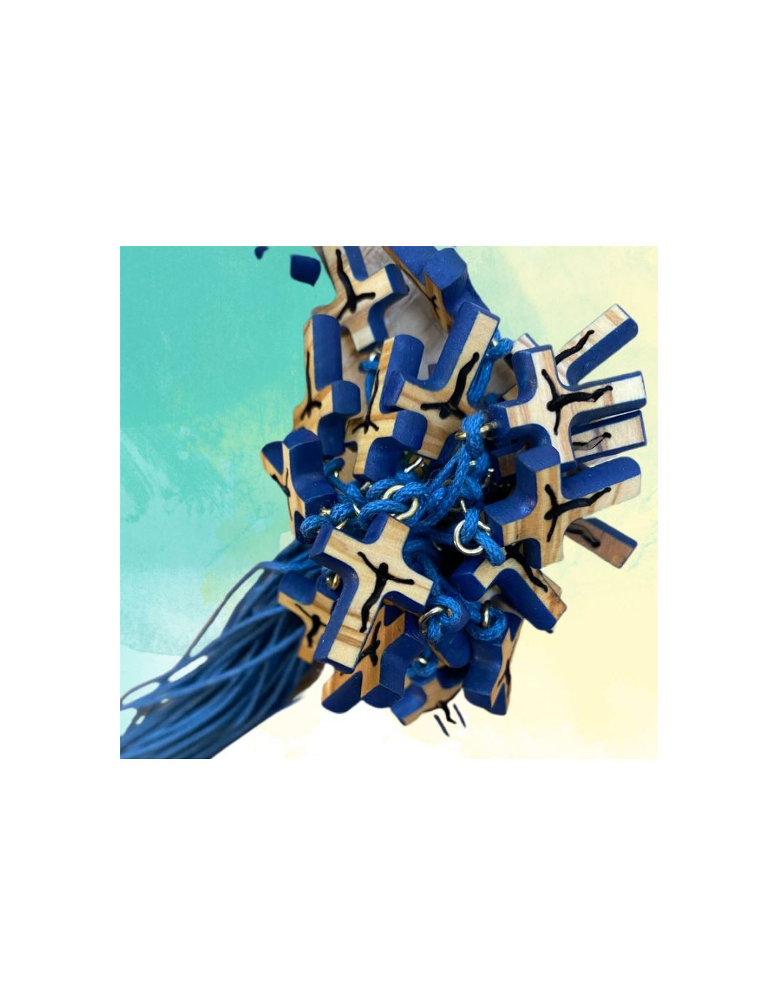 Ketting met verstelbaar koord en hanger van olijfhout. Het koord en de randen van de hanger, een kruis, zijn blauw geschilderd. De binnenkant van het kruis is gesneden naar het beeld van de gekruisigde Jezus Christus.