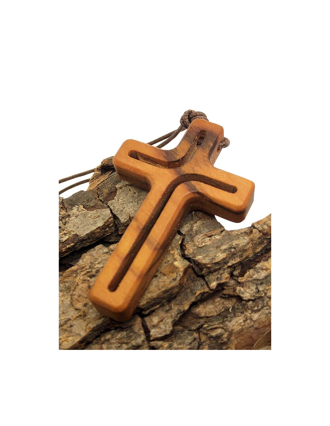 Het kruis, met zijn twee rondingen, is gemaakt van olijfhout, een speciale houtsoort die direct herkenbaar is vanwege de fijne nerf en lichte kleur. Het koord is gemaakt van bruin leer.