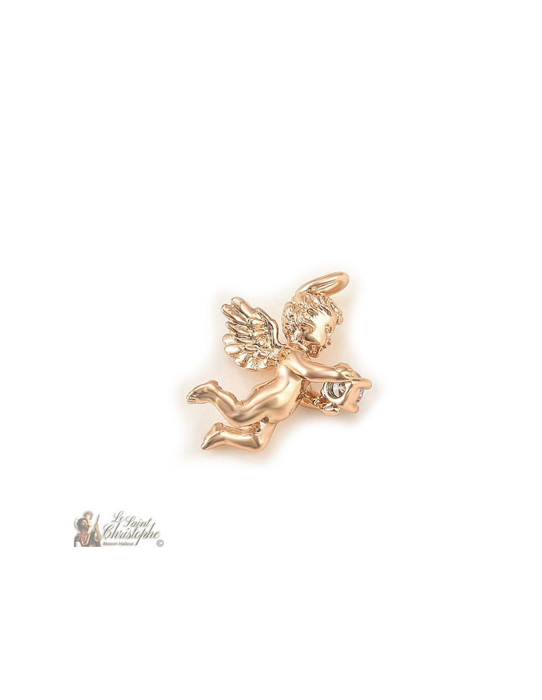 Deze discrete en fonkelende hanger stelt een cherubijn voor die een kristal vasthoudt. Met zijn licht rozige goudkleur kan het engeltje worden gecombineerd met een brede waaier van kettingen en halskettingen.