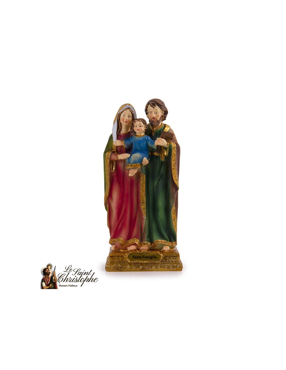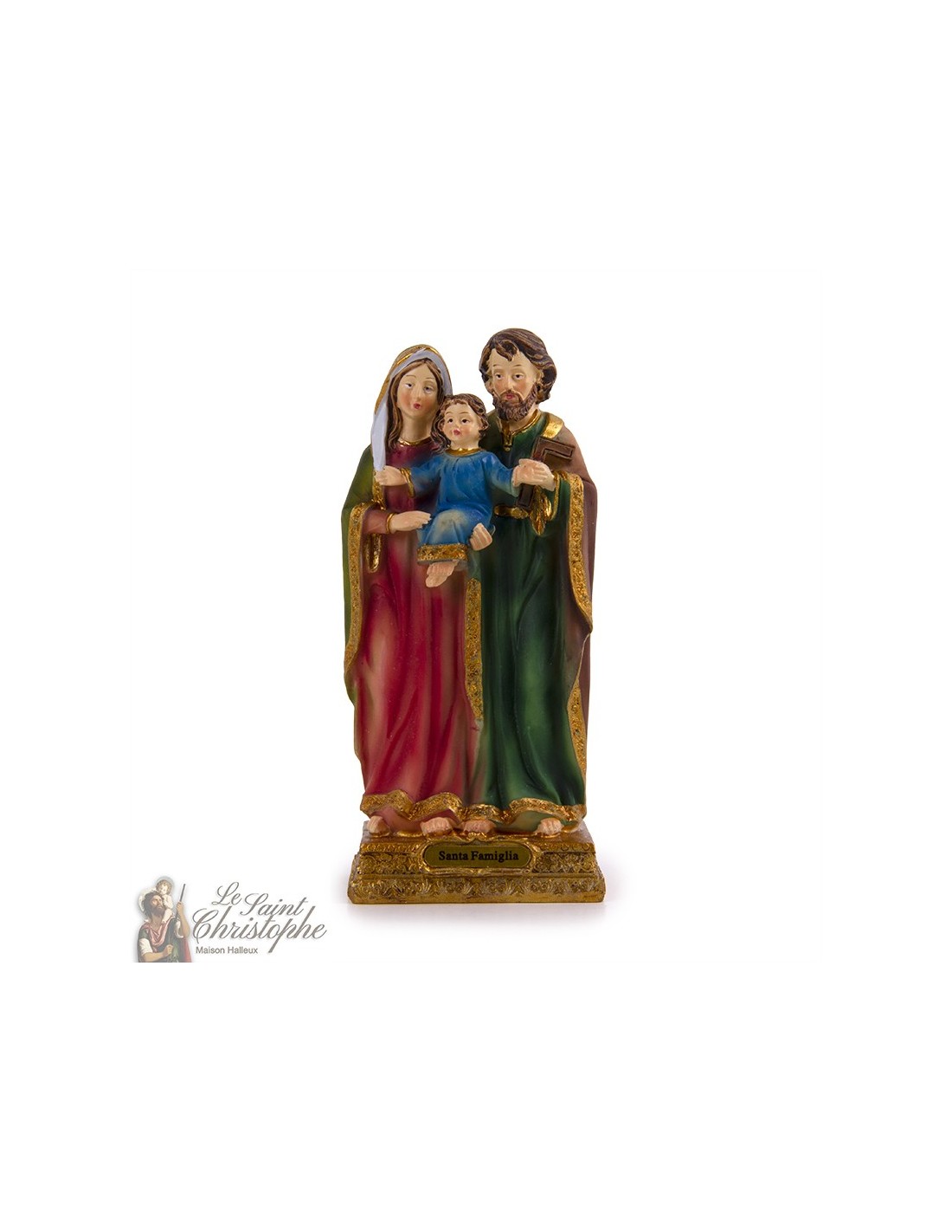 Beeldje van de Heilige Familie, delicaat gebeeldhouwd en met de hand beschilderd door professionele ambachtslieden. De sculptuur is gemaakt van hars en combineert stevigheid en lichtheid. Een gouden plaat herinnert aan de naam van de afgebeelde figuur.