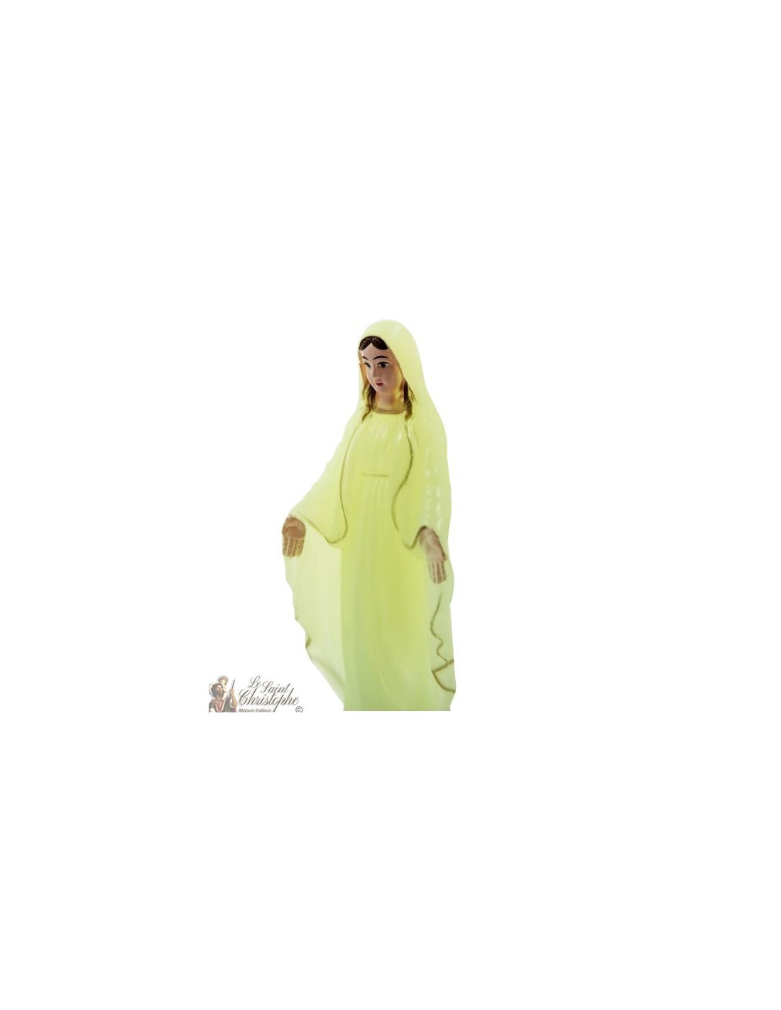 Standbeeld in kunsthars met enkele verfstreken, met de beeltenis van de Wonderbaarlijke Maagd. De hars is fluorescerend en gloeit in het donker na blootstelling aan licht.