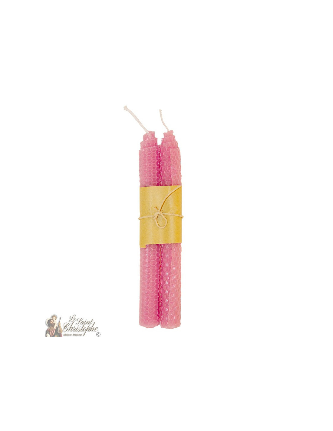Paar kaarsen gekleurd in de massa in roze. De was is op zichzelf gerold, wat een spiraaleffect geeft, en bedrukt met een zeshoekig patroon dat aan een bijenkorf doet denken.