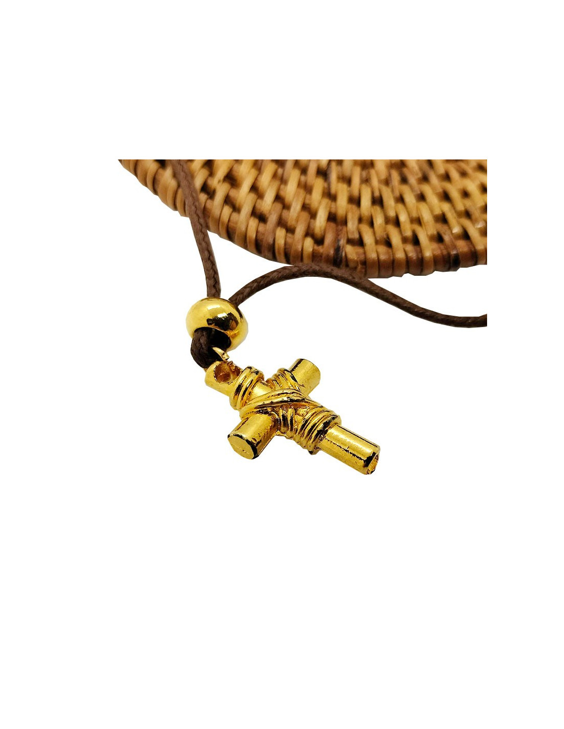 Verguld metalen hanger die een kruis voorstelt, geregen aan een bruin leren koord met een verguld metalen hendelsluiting.