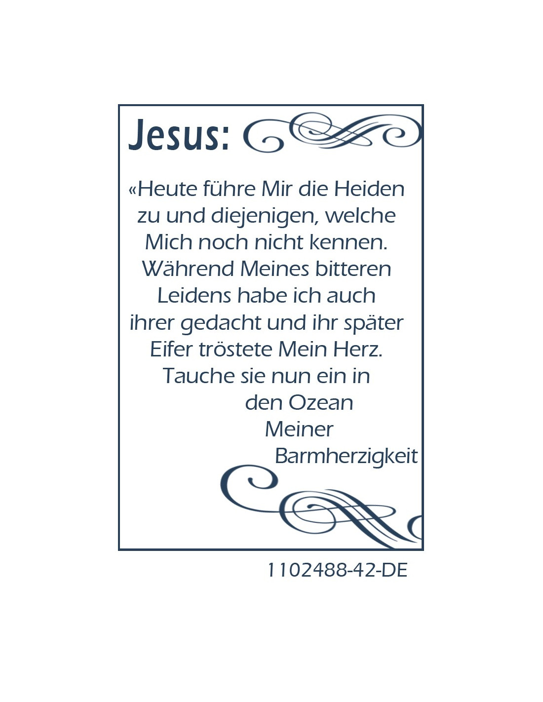 Deze medaille-kaart eert de Barmhartige Christus. De kaart is bedrukt met een schilderij van Jezus Christus en een gebed in zijn naam. Het is versierd met een medaille van de Barmhartige Christus, die u kunt uitknippen om als hanger te dragen of als souvenir bij de kaart kunt laten. Het gebed vraagt Jezus om zijn liefde en mededogen om te helpen in moeilijke situaties.