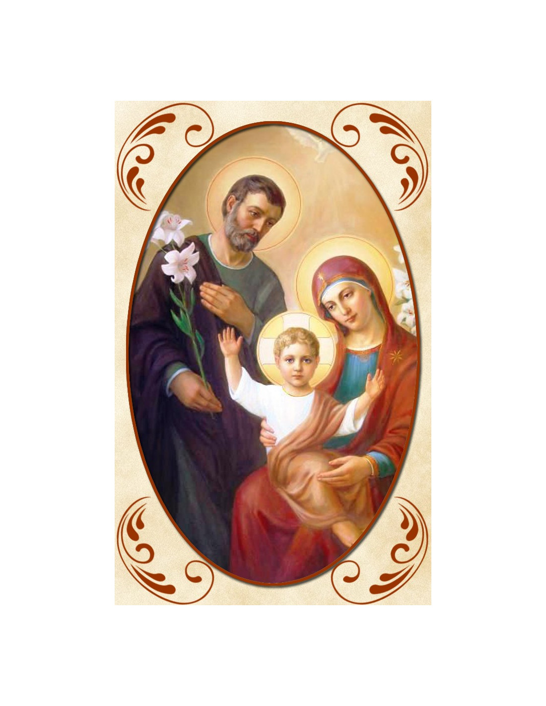 Deze medaille-kaart eert de Heilige Familie. De kaart is bedrukt met een schilderij van de Heilige Familie en een gebed in hun naam. Het is versierd met een medaille van de Heilige Familie, die u kunt uitknippen om als hanger te dragen of als souvenir bij de kaart kunt laten.