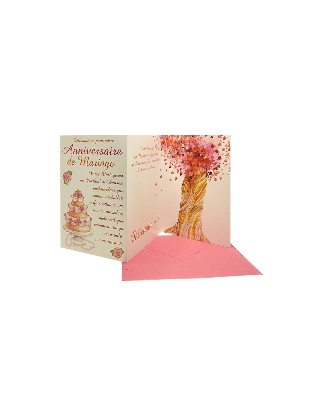 Vier een trouwdag met een kaart vol zoetigheid! Deze drieluikkaart, versierd met een kleurrijke taart met meerdere lagen en een boom met hartvormige bladeren, bevat een poëtische tekst in het Frans en biedt ruimte voor je persoonlijke notities. Wordt geleverd met een bijpassende roze envelop.