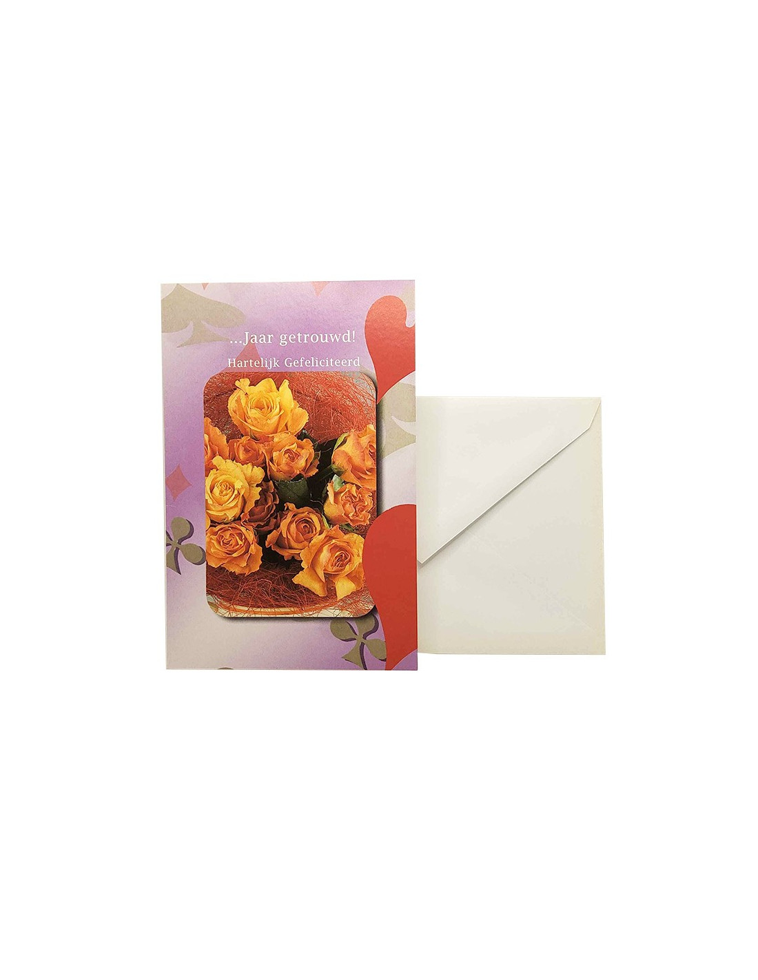 Vier het eerste huwelijksjaar van een stel met deze elegante kaart voor een huwelijksjubileum! Versierd met een prachtig boeket gele en oranje rozen, een symbool van vreugde en passie, drukt de kaart alle schoonheid en kracht van een ontluikende liefde uit. Het originele ontwerp combineert ook speelkaartmotieven, een knipoog naar geluk en het geluk dat twee mensen delen. Op de voorkant staat: "…Jaar getrouwd! – Hartelijk Gefeliciteerd" (vertaald als "…Een jaar getrouwd! Gefeliciteerd!"). De binnenkant van de kaart is leeg, zodat u een persoonlijke boodschap kunt schrijven, lief of humoristisch, geheel naar uw eigen stijl.