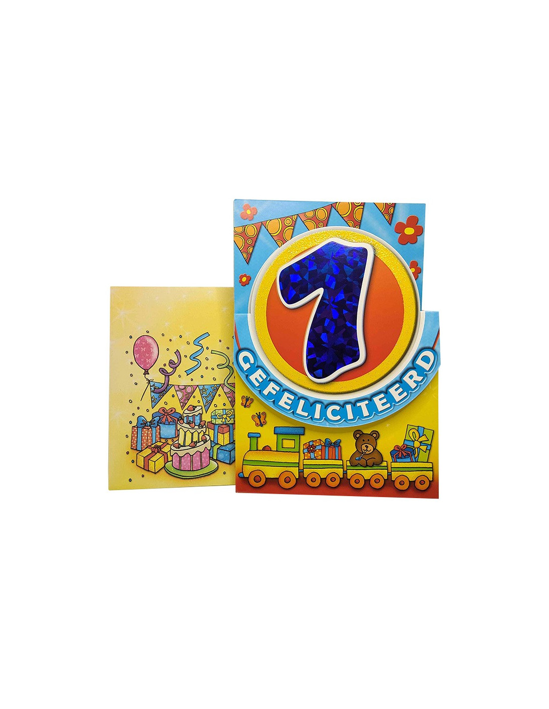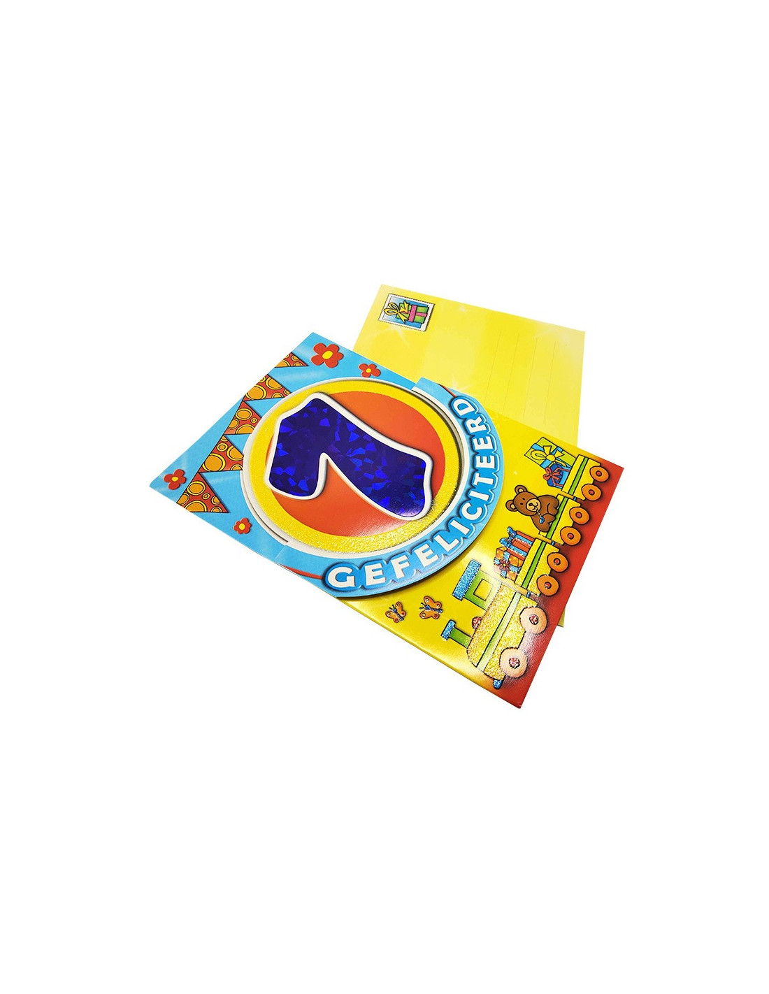 Vier het eerste levensjaar van een kind met een kleurrijke en feestelijke verjaardagskaart! Deze wenskaart is versierd met een groot holografisch cijfer “1”, omringd door glitters en felle kleuren voor een vrolijke sfeer. Het kinderlijke ontwerp toont een treintje, kleurrijke cadeautjes en een teddybeer, perfect om deze speciale mijlpaal in de vroege kinderjaren te vieren.