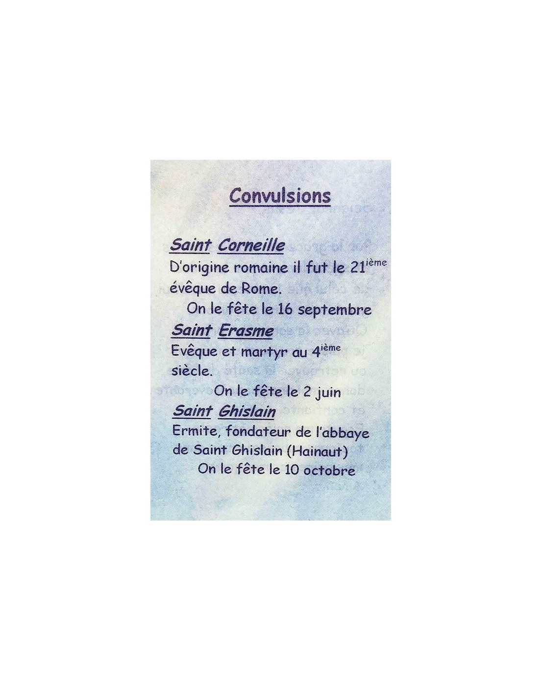 Deze kaart is een klein, discreet hulpmiddel om tot uw patroonheiligen te bidden. Ze is nuttig bij convulsies en geeft in enkele woorden uitleg over de patroonheiligen die helpen om deze te verlichten of te genezen: Sint-Cornelius, Sint-Erasmus en Sint-Ghislain. Op de achterkant staat een kort gebed gewijd aan Jezus en de genade van de patroonheiligen om troost te bieden bij inspanningen, het geloof te versterken, obstakels te overwinnen en bescherming te bieden tegen de kwalen van alledag.