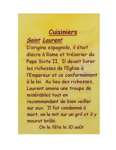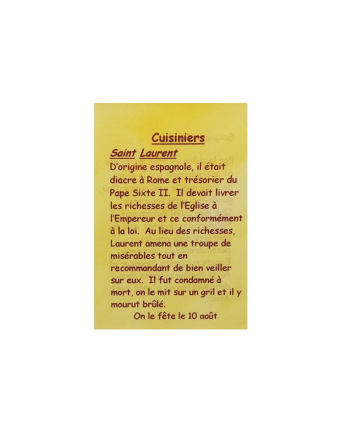 Deze kaart is een klein, discreet hulpmiddel om tot uw patroonheiligen te bidden. Ze is bedoeld voor koks en iedereen die daarmee te maken heeft en geeft in enkele woorden uitleg over hun patroonheilige: Sint-Laurentius. Op de achterkant staat een kort gebed gewijd aan Jezus en de genade van de patroonheiligen om troost te bieden bij inspanningen, het geloof te versterken, obstakels te overwinnen en bescherming te bieden tegen het kwaad van alledag.