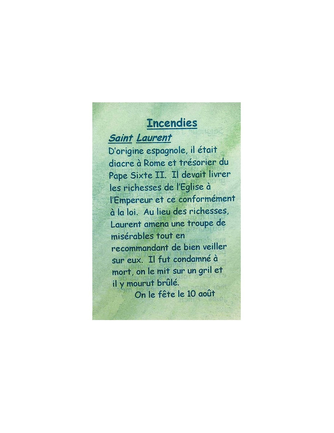 Deze kaart is een klein, discreet hulpmiddel om tot uw patroonheiligen te bidden. Ze is voor iedereen bedoeld, want het is een gebed voor branden. Op de kaart staat een korte uitleg over de patroonheilige: Sint-Laurentius. Op de achterkant staat een kort gebed gewijd aan Jezus en de genade van de patroonheiligen om troost te bieden bij inspanningen, het geloof te versterken, obstakels te overwinnen en bescherming te bieden tegen het kwaad van alledag.