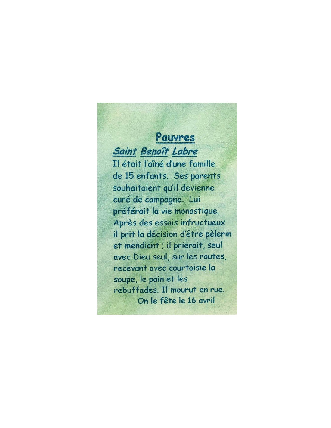 Deze kaart is een klein, discreet hulpmiddel om tot uw patroonheiligen te bidden. Ze is voor iedereen bedoeld, want het is een gebed voor de armen. Op de kaart staat een korte uitleg over de patroonheilige: Sint-Benedictus Labre. Op de achterkant staat een kort gebed aan Jezus en de patroonheiligen om troost te bieden bij inspanningen, het geloof te versterken, obstakels te overwinnen en bescherming te bieden tegen het kwaad van alledag.