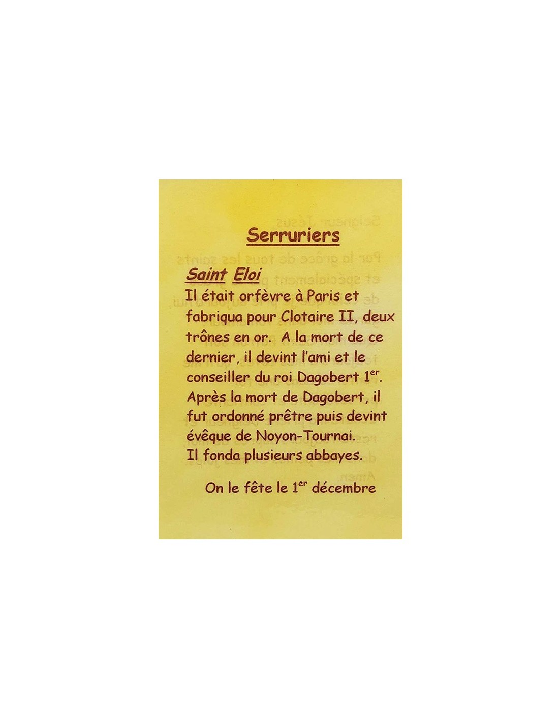 Deze kaart is een klein, discreet hulpmiddel om tot uw patroonheiligen te bidden. Ze is bedoeld voor slotenmakers en alles wat daarmee te maken heeft en geeft in enkele woorden uitleg over hun patroonheilige: Sint-Elooi. Op de achterkant staat een kort gebed gewijd aan Jezus en de genade van de patroonheiligen om troost te bieden bij inspanningen, het geloof te versterken, obstakels te overwinnen en bescherming te bieden tegen het kwaad van alledag.