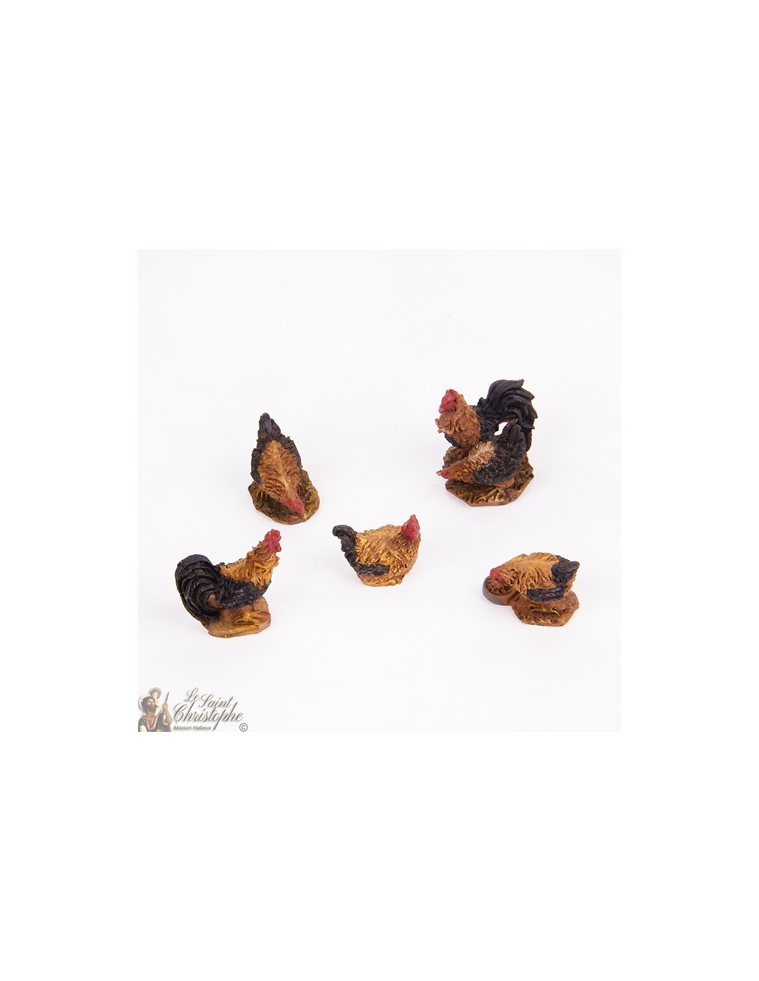 Set van 5 stuks kippen en hanen voor de decoratie van kerststallen, kerstdorpjes, poppenhuizen of diorama's. Deze dieren zijn perfect om een vleugje realisme aan de decoratie toe te voegen. Ze passen in scènes met figuren tussen 11 en 13 cm hoog om de juiste verhoudingen te behouden.