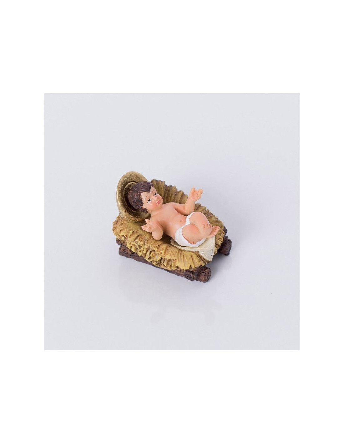 Dit beeldje van het kindje Jezus is een essentieel onderdeel van kerststallen. Dit realistische beeldje is gemaakt van beschilderd hars en heeft natuurlijke, levendige kleuren, met een klein beetje goud voor de aureool van Jezus Christus.