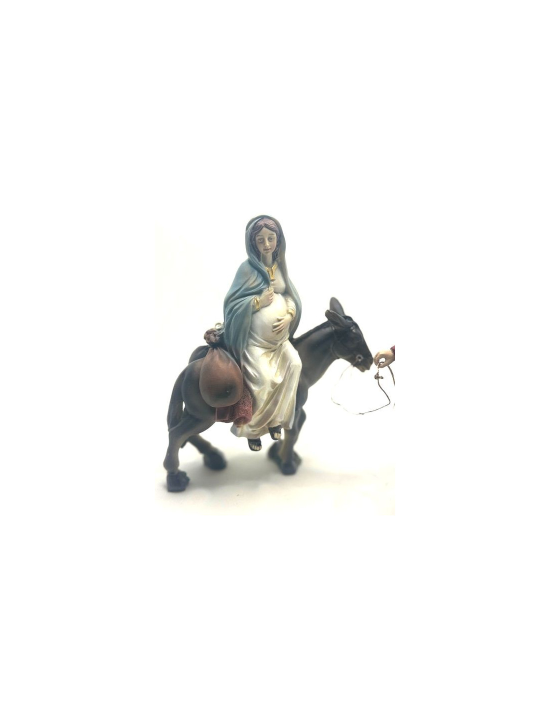 Dit beeld van hoge kwaliteit hars toont Maria zwanger, zittend op een ezel en geleid door Jozef. Een uitdrukkelijk en fijn gedetailleerd kunstwerk dat de spirituele diepte van dit heilige moment weergeeft.