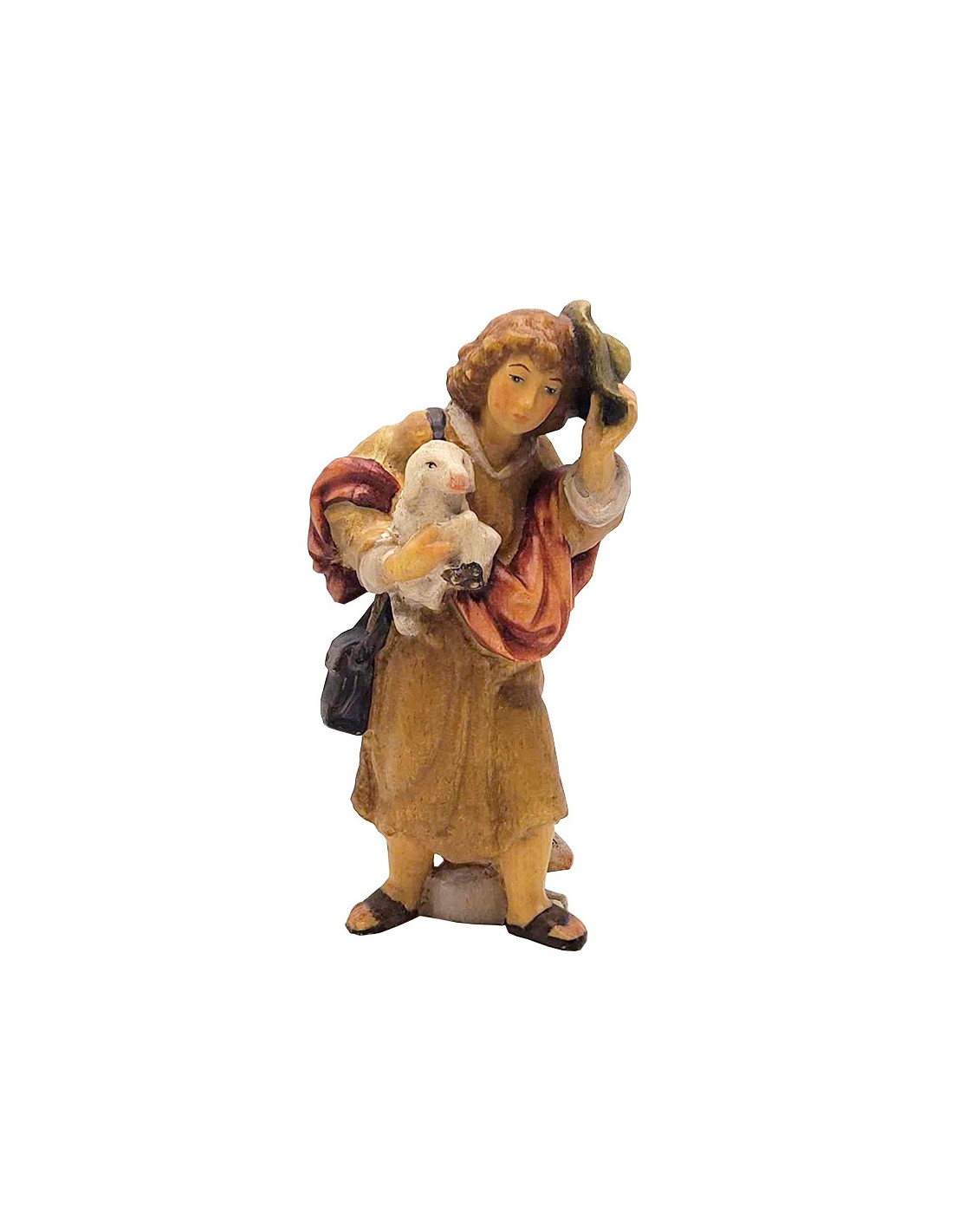 Ontdek dit prachtige beeldje van een herder met lam uit onze collectie kerststal- en kerstdorndecoraties! Dit houten beeldje is met de hand gesneden en beschilderd, met een bijzonder gedetailleerde afwerking. De jonge man staat afgebeeld met een lam in zijn armen, terwijl hij groet door zijn hoed af te nemen, met een liggend schaap achter hem. Om de verhoudingen consistent te houden, past het beeldje perfect in decors of scènes met figuren van ongeveer 10 tot 12 cm hoog.