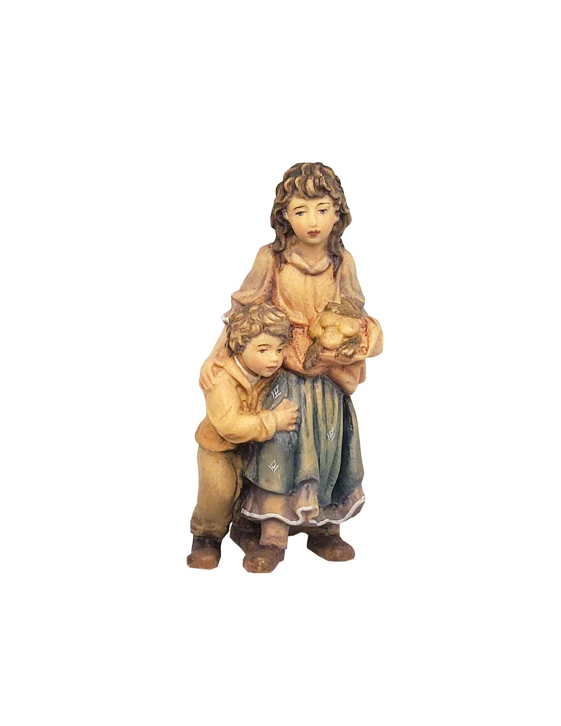 Figuurtje van een jonge herderin en een kind, gemaakt van hout en met een verfijnde afwerking, met de hand gesneden. Dit beeldje is een mooie aanvulling op een kerststal, een dorpje met kerstfiguurtjes, een poppenhuis of een diorama. Het stelt een jonge vrouw voor die broden vasthoudt, met een kind dat zich aan haar rokken vastklampt.