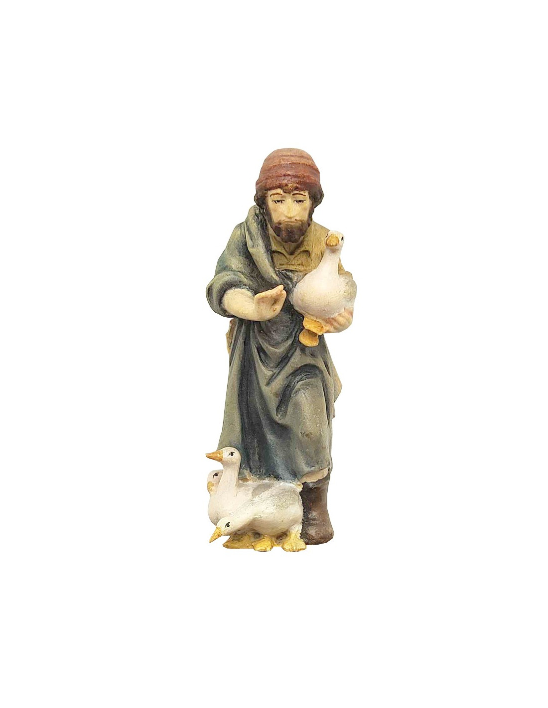 Figuur van een volwassen herder in hout met delicate afwerking, met de hand gesneden. Dit beeldje is een mooie aanvulling voor een kerststal, een dorpje met kerstfiguurtjes, een poppenhuis of een diorama, en stelt een herder voor die een gans vasthoudt, met enkele ganzen aan zijn voeten.