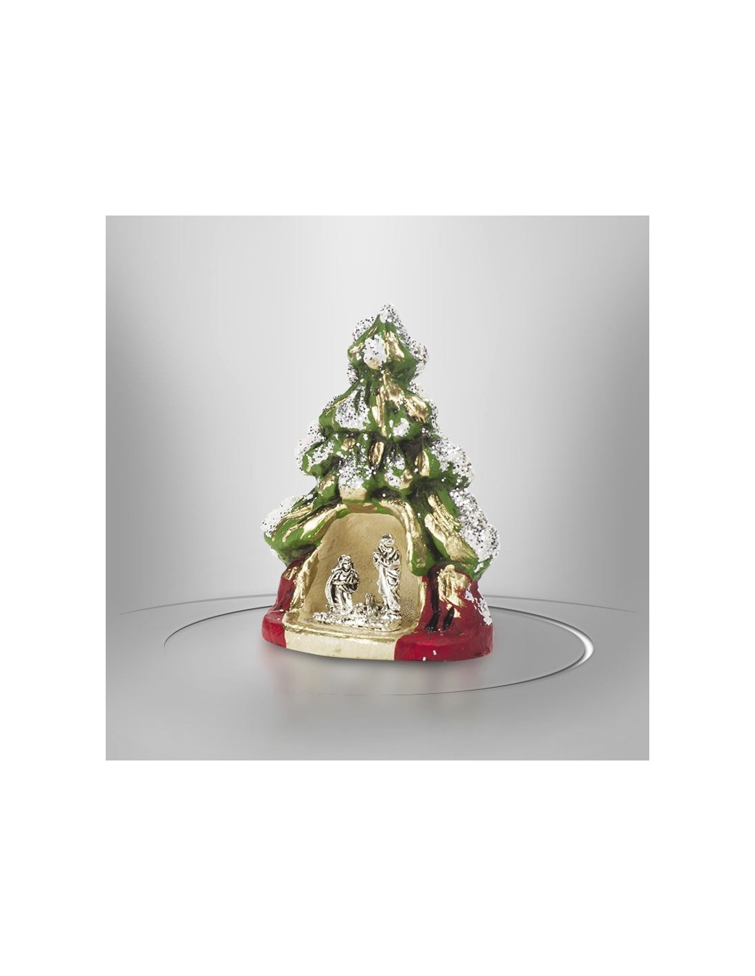 Deze mini kerststal in de vorm van een besneeuwde dennenboom is een prachtige decoratie voor de eindejaarsfeesten. Met de figuren van Jezus, Maria en Jozef in verzilverd metaal en beschermd door een prachtige dennenboom in terracotta in de kleuren groen, rood en goud, past dit kleine model kerststal perfect in de decoratie. De zilveren glitters geven het geheel een feestelijk tintje voor de winter, als glinsterende sneeuwvlokken voor het seizoen.