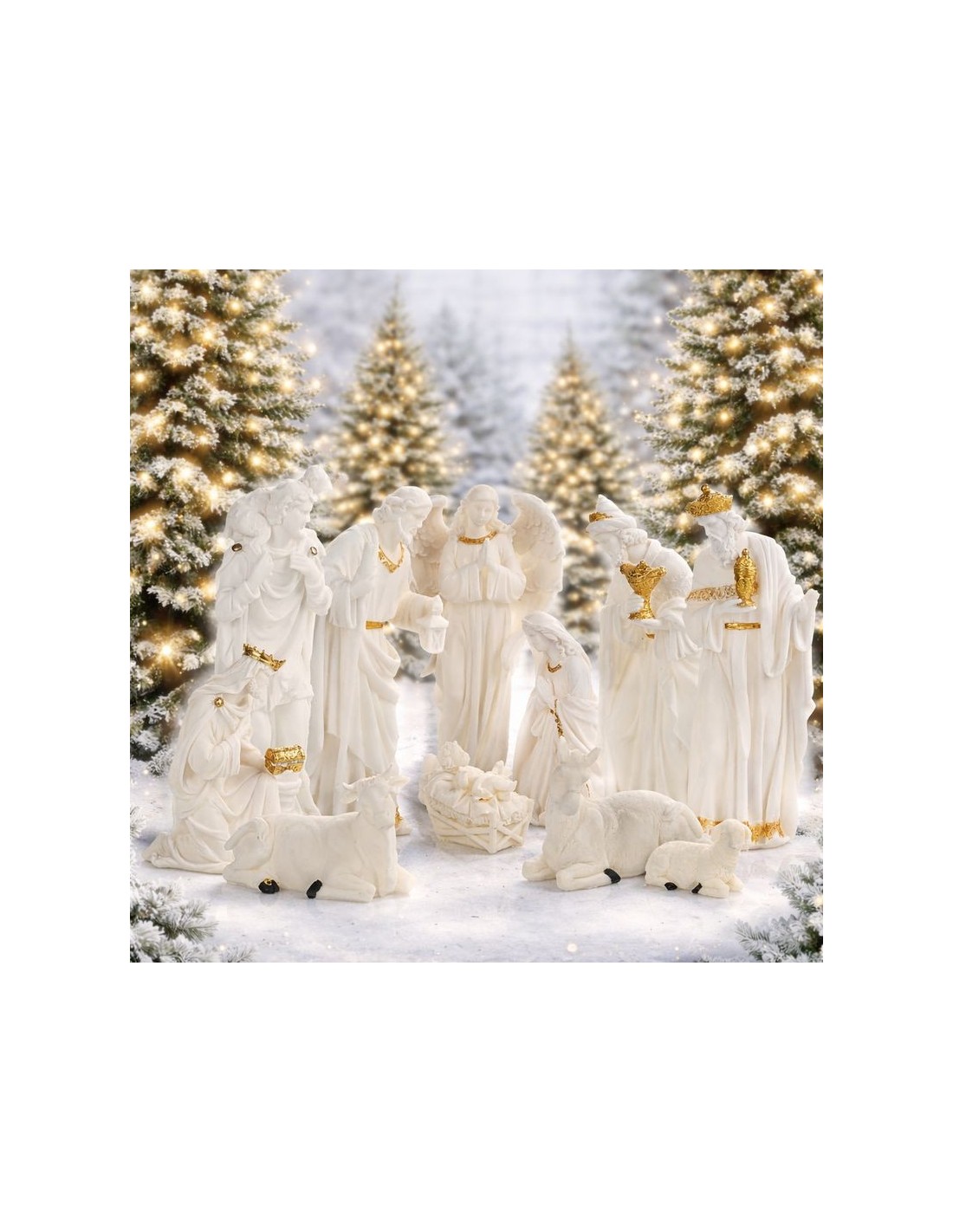 Breng elegantie en rust in uw kerstdecoratie met deze prachtige witte kerststal van hoogwaardige hars, verfijnd met gouden accenten.